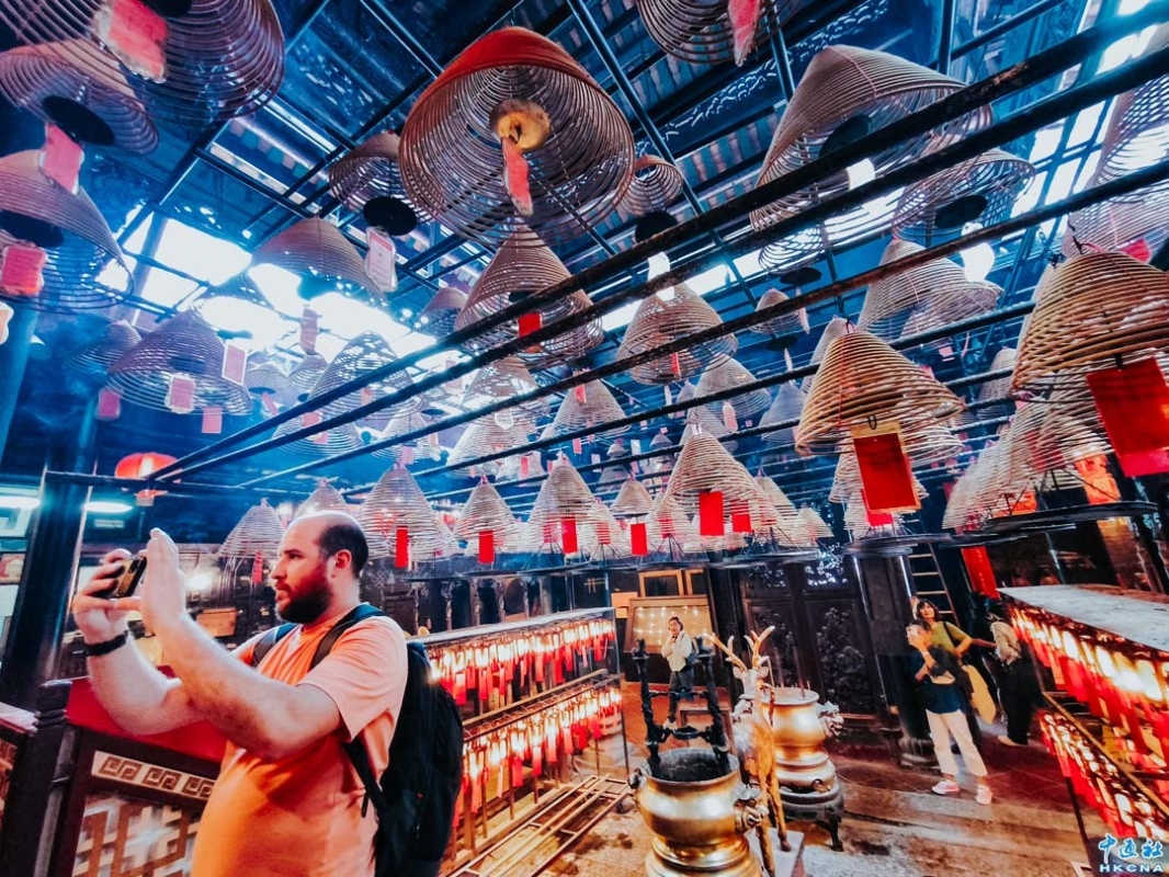 近日,香港發展旅遊熱點工作組公佈首階段旅遊熱點落實項目,公佈九個旅遊熱點項目,包括能回溯香港工業品牌變遷、中環citywalk(漫步)、生態遊,再闖入九龍城遊歷城寨風光,並擬開放旅客熱熾期望的“打卡”熱點。圖為中環文武廟吸引外國遊客到此感受傳統文化。(香港中通社記者洪少葵攝)