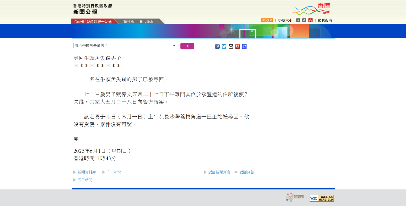 該名男子6月1日上午在長沙灣荔枝角道一巴士站被尋回。他沒有受傷,案件沒有可疑。  (完)