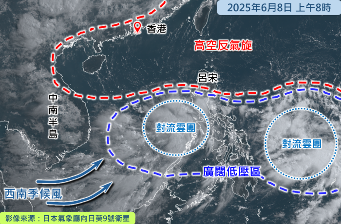 6月8日上午8時的衛星雲圖。圖源:香港天文台 天文台預告,位於南海中部的廣闊低壓區預料會在今明兩日逐漸發展為熱帶氣旋,天文台將視乎其發展速度和進入香港800公里範圍的時間,最早在10晚上至11日初時發出一號戒備信號。預料該熱帶氣旋在本周中後期大致移向廣東西部沿岸至海南島一帶,天文台會視乎其與本港的距離和發展速度,評估是否需要在12日稍後至13日改發更高熱帶氣旋警告信號。 特區政府勞工處提醒僱主及僱員,在酷熱天氣警告生效期間採取適當措施,以預防在酷熱天氣下或高溫環境中工作而引致中暑。(完) 【編輯:彭玉婷】