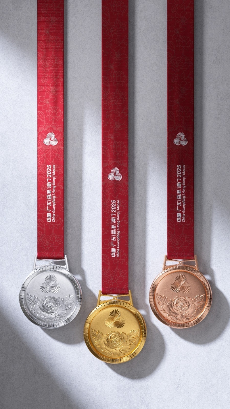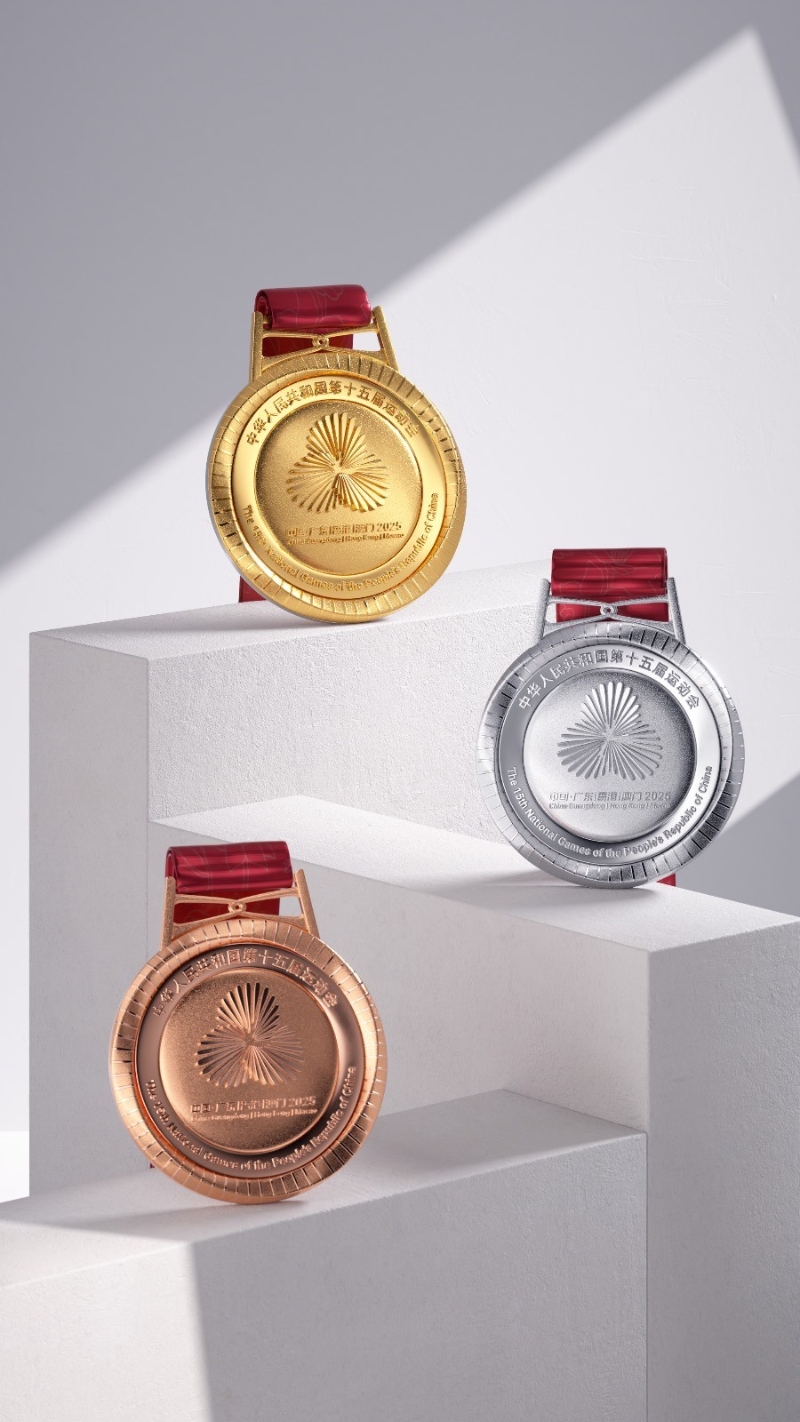 競體項目獎牌。 香港特區政府全運會統籌辦公室主任楊德強說,獎牌設計很漂亮、高雅,有活力,體現香港在設計方面的實力,設計團隊由香港設計師牽頭,亦有內地設計師協助,體現三地努力辦好賽事。 競體項目及群體項目獎牌的設計靈感均源自全運會的官方會徽,並以三組遞進式層次的立體結構呈現,突顯三地禮花元素、交融互通、活力無限。獎牌外邊設計的三組水圓以莫比烏斯形環呈現,代表生生不息的連接與無限可能,邊緣有66道紋路,致敬全運會66年歷史。 其中,競技體育項目獎牌重354.5 克,一面正中上方的會徽由代表粵港澳三地的花瓣交叠扭轉形成同心禮花,下方牡丹花托舉而上,寓意粵港澳大灣區依託祖國的堅實後盾蓬勃發展,為民族復興貢獻力量。另一面中間的吉祥物中華白海豚手舉火炬,靈動活潑,周圍浪濤造型的數字“15”巧妙地將全運會屆別與體育精神的傳承完美結合。