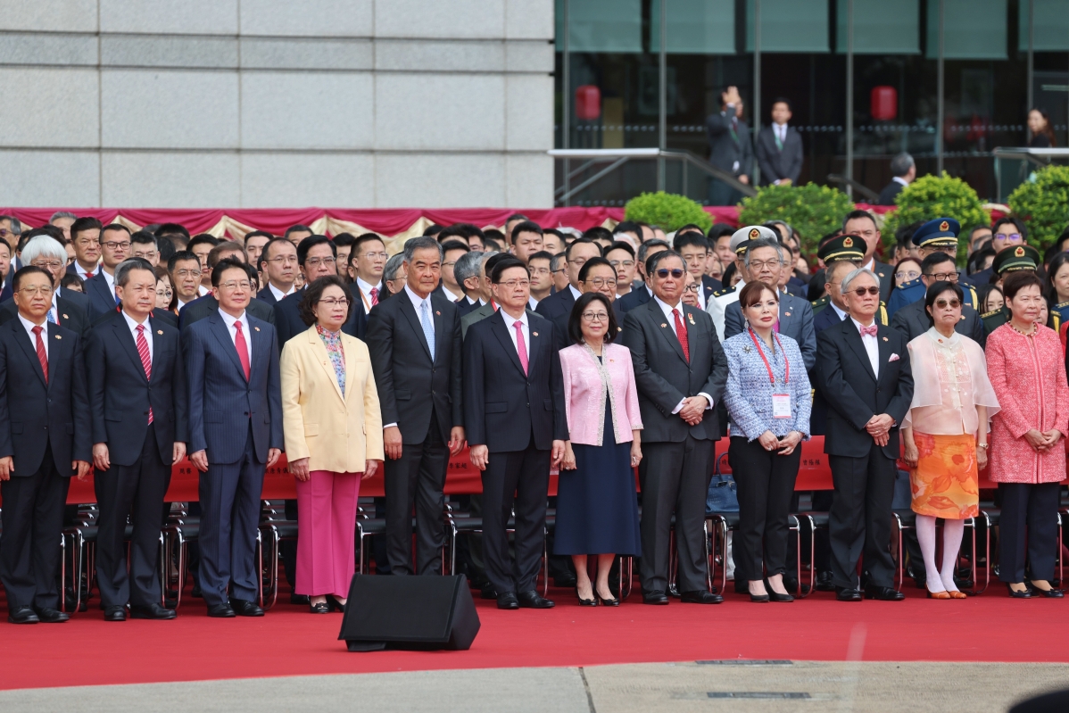 全國政協副主席梁振英(左五)、香港特區行政長官李家超(左六)、中央政府駐港聯絡辦主任周霽(左三)等嘉賓出席升旗儀式