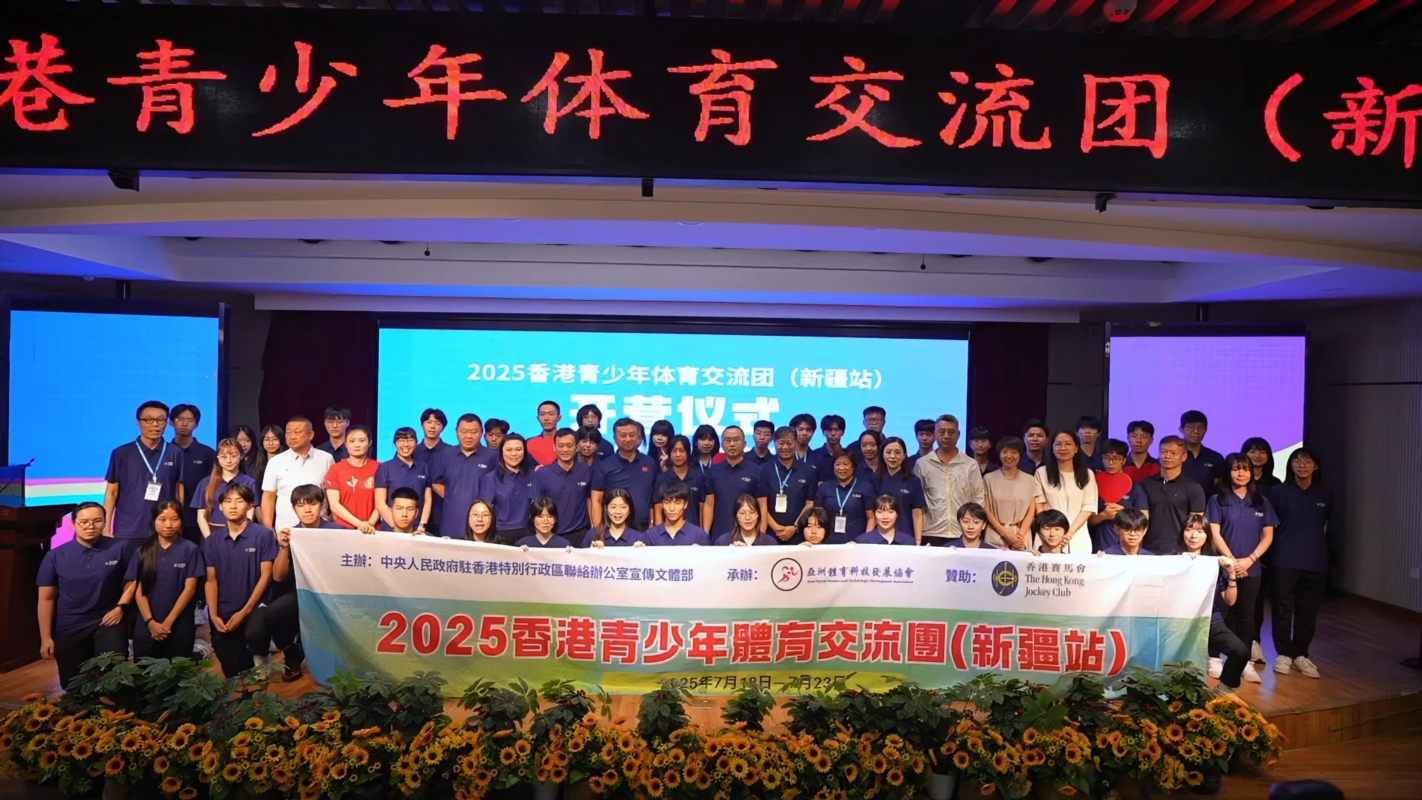 香港新聞網7月21日電 由中央人民政府駐香港特別行政區聯絡辦公室宣傳文體部主辦,香港賽馬會贊助,亞洲體育科技發展協會承辦,新疆企業體育協會協辦,得到新疆維吾爾自治區體育局、新疆維吾爾自治區教育廳等部門的大力支持的“2025香港青少年體育交流團(新疆站)”7月19日在烏魯木齊市第127中學舉行開營禮,展開在烏魯木齊、鄯善、石河子等地為期六天的體育交流和文化體驗。 新疆維吾爾自治區體育局叶海副局長致詞中表示,香港與新彊相隔萬里,但同為對外開放的重要門戶,共同詮釋中華民族多元一體的豐富內涵,體育是促進交流的橋梁,期待兩地青少年在互動中增進友誼,共築未來。