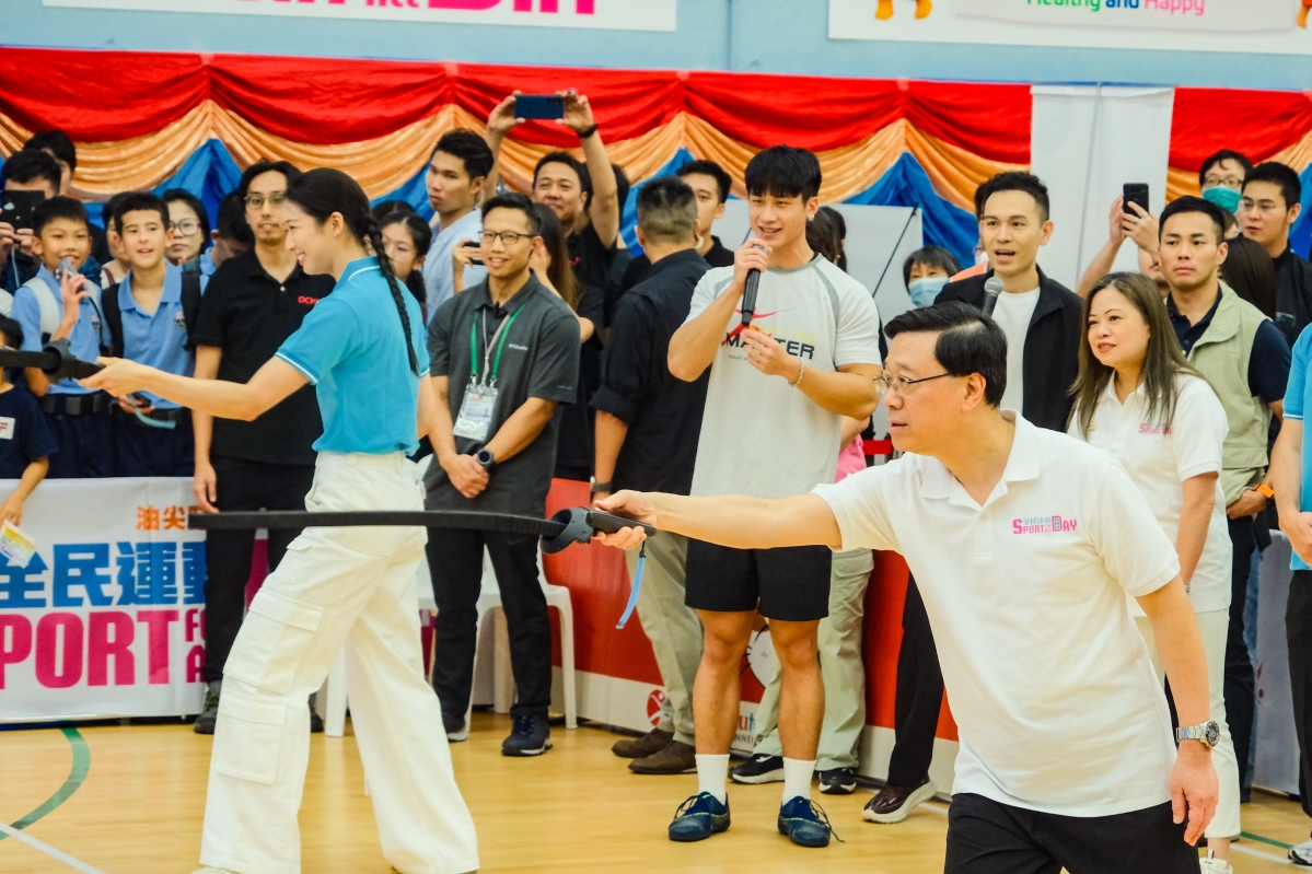 香港特區行政長官李家超(右)在九龍公園體育館出席活動并體驗擊劍游戲