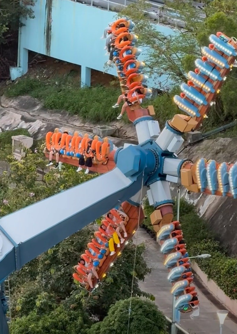 網上圖片顯示,停頓的遊樂設施是海洋公園的“狂野龍捲風”。海洋公園官方網頁介紹,“狂野龍捲風”是風車式旋轉巨型鋼臂和瘋狂的自轉式座椅,帶給乘客3種不同角度的重力極速旋轉。救援人員接報到場拯救被困人士。