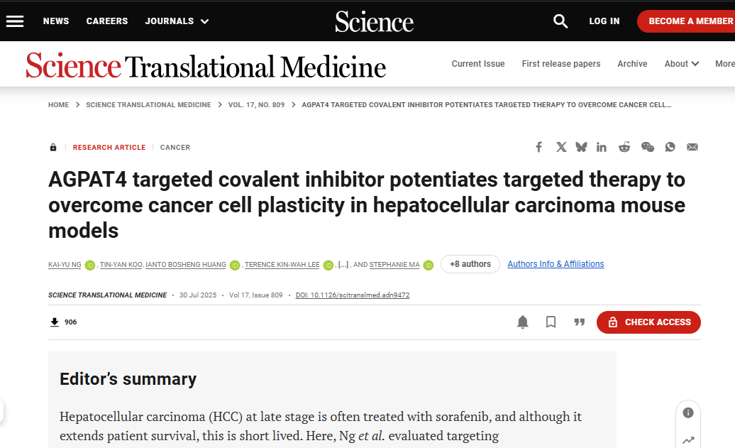 揭開腫瘤抗藥性之謎 肝臟在多種代謝功能中扮演關鍵角色。在肝細胞癌中,癌細胞大幅改變代謝過程以促進腫瘤生長。共同領導研究的港大醫學院生物醫學學院、鄧鉅明伉儷基金教授(分子遺傳學)馬桂宜教授闡釋:“我們的研究發現,某一特定代謝途徑有助癌細胞維持其幹性——即其生長、擴散和存活能力”。馬教授亦是香港大學協理副校長(研究及創新)。 此代謝途徑涉及一款名為AGPAT4的蛋白,它在胚胎幹細胞和肝細胞癌腫瘤細胞中被大量表達,但在正常組織中比較罕見。馬教授補充:“我們的數據顯示,AGPAT4蛋白如同一開關,增強癌細胞的靈活性和侵略性。這種腫瘤可塑性與增加癌症擴散及對現有治療(如常用於肝癌的索拉非尼)產生抗藥性之風險有關。” 研究團隊發現,AGPAT4蛋白促進脂肪分子LPA(溶血磷脂酸)轉化為PA(磷脂酸),激活mTOR等蛋白的信號途徑,從而促進腫瘤生長與存活。馬教授表示:“在小鼠模型中阻斷AGPAT4蛋白,能令腫瘤生長減緩,且提高索拉非尼的治療效果。” 開發針對AGPAT4的抑制劑 鑑於AGPAT4蛋白在肝細胞癌的重要性,團隊研發了專門針對AGPAT4的化合物CL26。在患者腫瘤研究模型中,CL26結合索拉非尼能顯著抑制腫瘤增生。加上毒理學評估顯示副作用低,展現出CL26在臨床治療中安全應用的潛力。 共同領導此研究的港大醫學院生物醫學學院助理教授鍾亦琛教授表示:“團隊的突破是向前邁出的重要一步,CL26讓我們能精準地靶向肝癌細胞,為患者提供一個全新且更有效的治療方法。” 聚焦臨床試驗以驗證治療潛力方面,馬教授續稱:“我們的研究顯示,AGPAT4蛋白使肝細胞癌細胞更具適應性和抗藥性。通過抑制此蛋白,我們可增強索拉非尼療效,增加臨床患者的治療選擇。我們希望為無數對抗這一棘手疾病的患者帶來希望。” 鍾教授補充:“CL26能精準靶向AGPAT4蛋白並抑制其活性,是帶來顯著效果的關鍵原因。我們正進行更大規模的臨床前研究,以進一步評估CL26的療效與安全性,並希望推進至新藥研究及臨床試驗階段。” (完) 【編輯:譚暢】