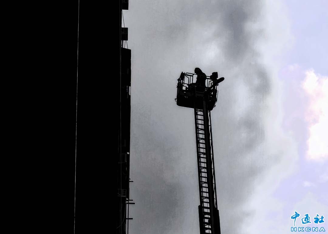 8月23日下午,香港北角英皇道330號一幢大廈發生火警。現場消息指一名年約70歲的男子燒傷,昏迷送往律敦治醫院搶救。圖為警方和消防出動,一隊煙帽隊灌救並升起雲梯。 (香港中通社記者 洪少葵攝)