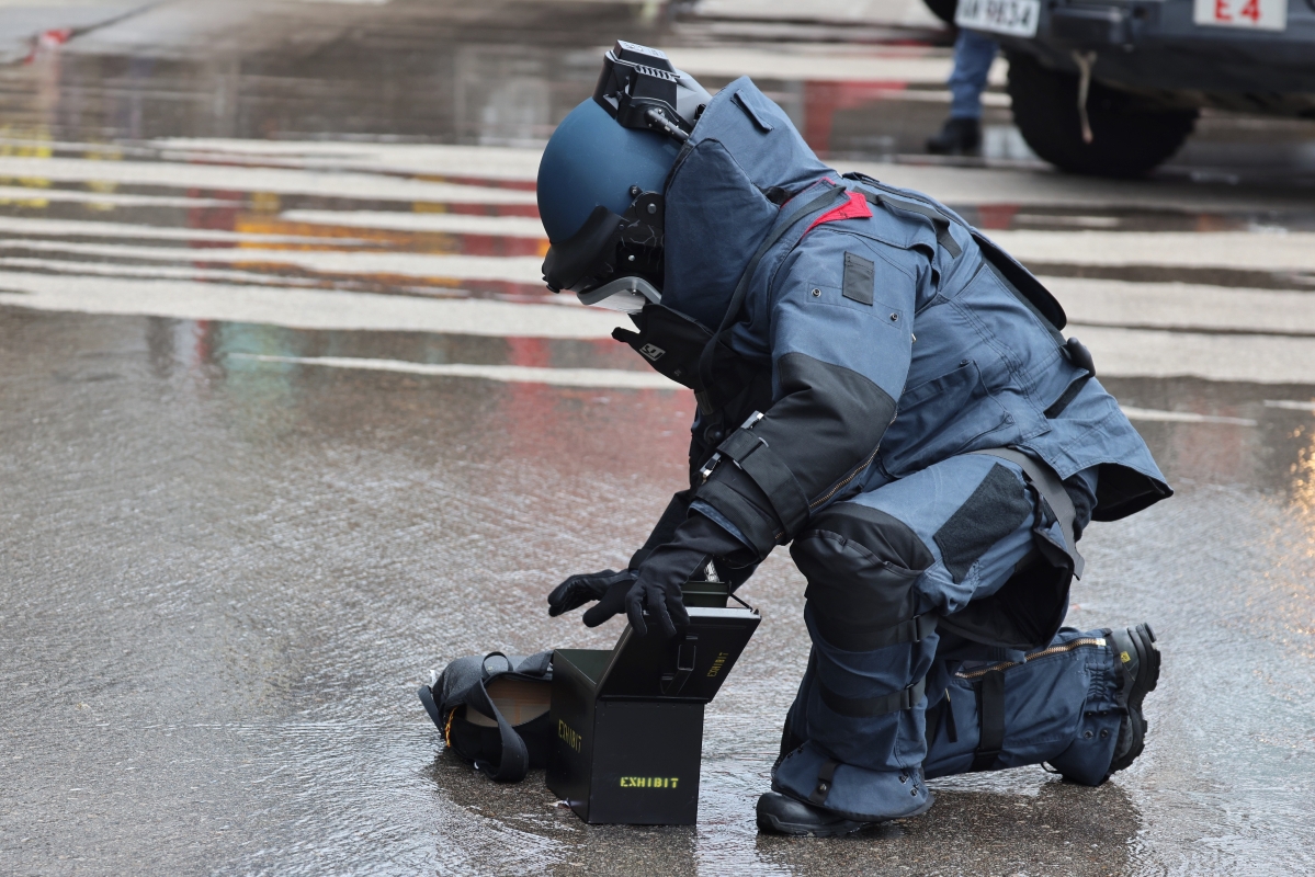 演習模擬警方在現場地下發現一個電線外露的黑色背囊,懷疑裏面藏有爆炸品。炸彈處理主任身穿重達八十多磅防爆衣上前作出檢查,確保可疑物品已經安全處理。