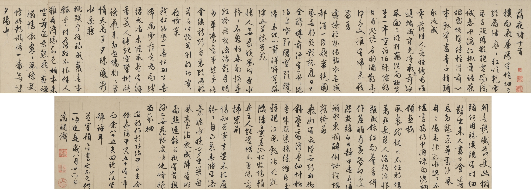 文徵明師生《落花詩書畫》。(中大文物館供圖) 黃秉章家族成員代表黃匡濟致辭時憶述,“展覽命名為‘嶺海墨林’,寓意珠江三角洲一帶的水墨收藏。這批書畫收藏主要於第一次至第二次世界大戰期間在廣州建立,後來遷移到香港。當年,我與利乾、利憲彬是網球場上的好友,而家父黃秉章則與利銘澤、利孝和、利榮森建立了多年深厚的友誼。我們家族十分樂見這些收藏捐贈予由利榮森協助成立的中文大學文物館。這次展覽正好展示利氏家族與黃氏家族的百年世交,結出碩果。”