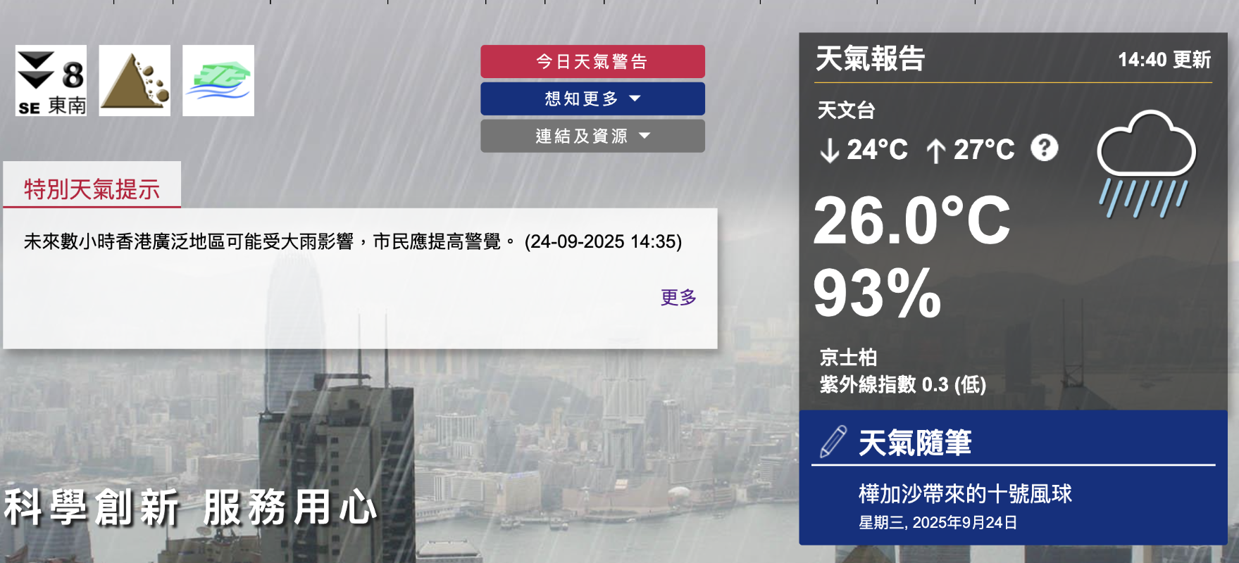 香港新聞網9月24日電 香港天文台24日下午2點35分發出特別提醒,未來數小時香港廣泛地區可能受大雨影響,市民應提高警覺。