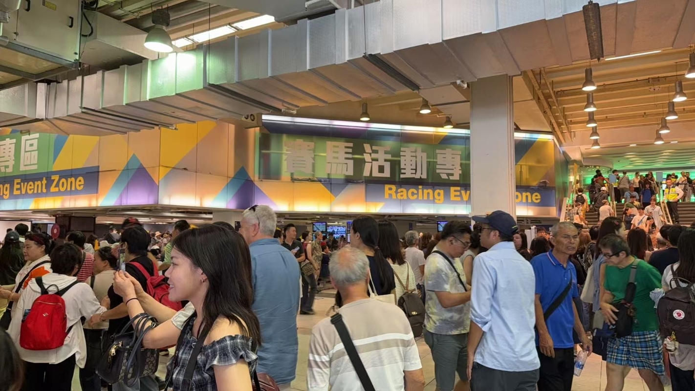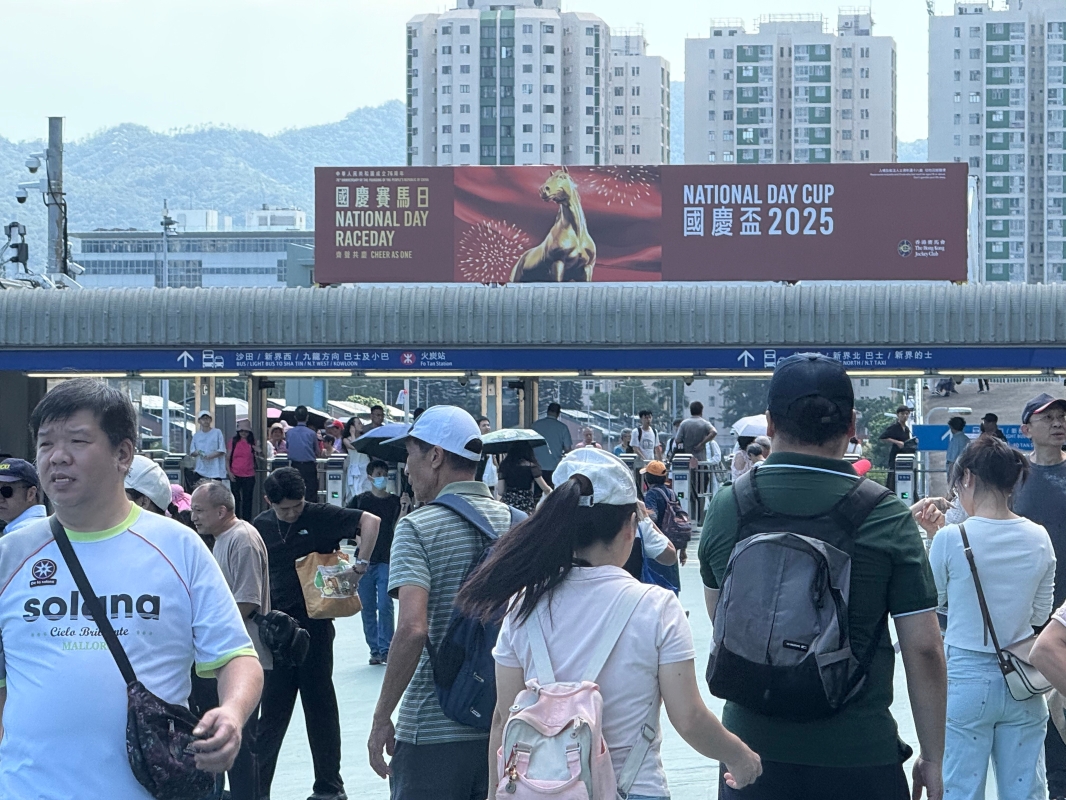 香港中通社10月1日電 (記者 譚暢)10月1日國慶日,香港沙田馬場人潮洶湧。為慶祝中華人民共和國成立76周年,香港賽馬會舉辦“國慶賽馬日”,吸引海量市民及遊客入場。 沙田馬場當天的門票全免,入場閘機外人流絡繹不絕,旅行團匯聚成一片片人海。場內有遊客臉上貼著五星紅旗貼紙,與馬場內特別設置的國慶主題打卡區合照,節日氣氛熱烈。 中午12時許,國慶賽馬日開幕儀式在馬匹亮相圈舉行,看台上層層疊疊擠滿了觀眾。中國國家男高音歌唱家張英席帶來《我的祖國》等多首經典曲目。其後,隨著國歌奏響,全體嘉賓及觀眾起身肅立,高唱國歌。 不止是看台,馬場餐飲區也座無虛席,當日餐飲均打76折,燒臘飯、牛雜、魚蛋等港式特色食物吸引大量訪客排隊。部分市民甚至端著小吃,抓緊每分每秒,邊吃邊觀看比賽;投注區域更人頭攢動,座無虛席,有市民在銀行自動櫃員機旁排隊提款,準備加入這場盛事。