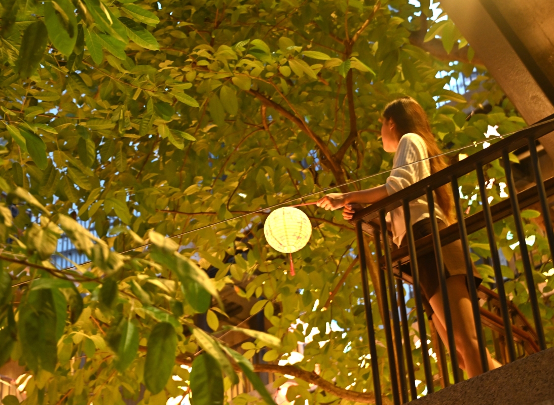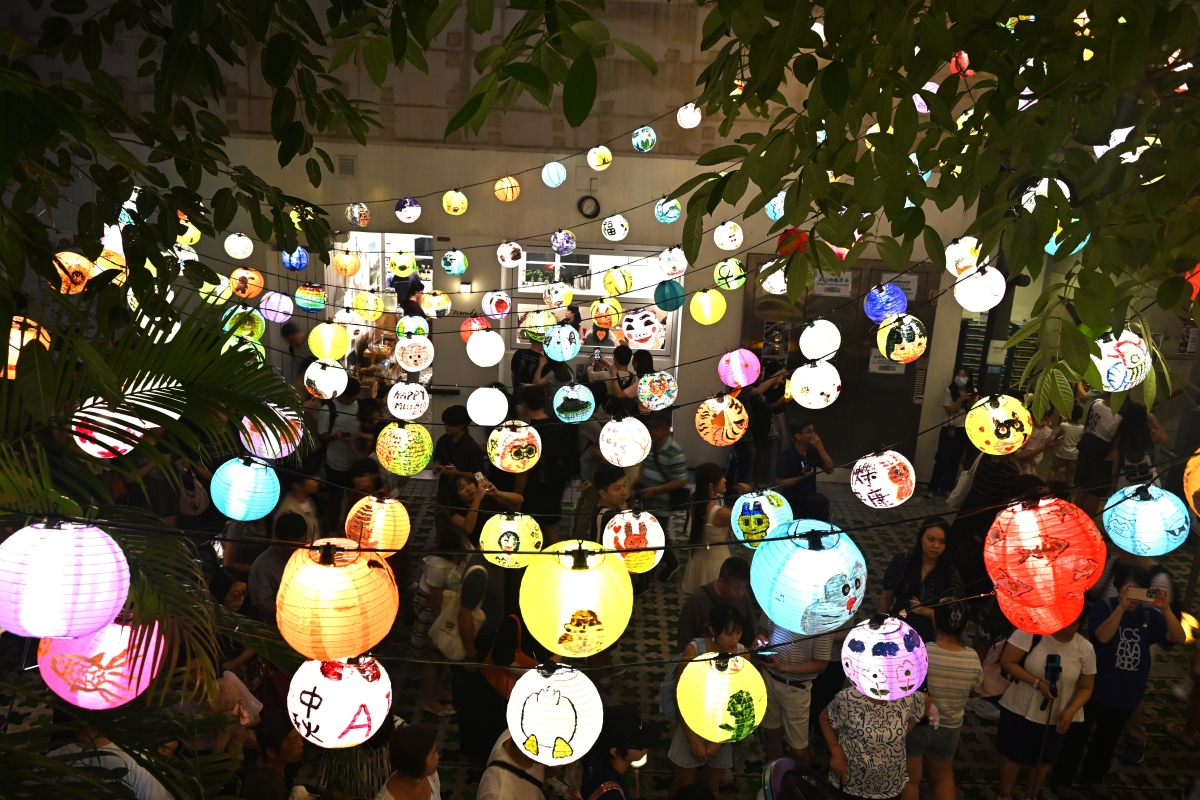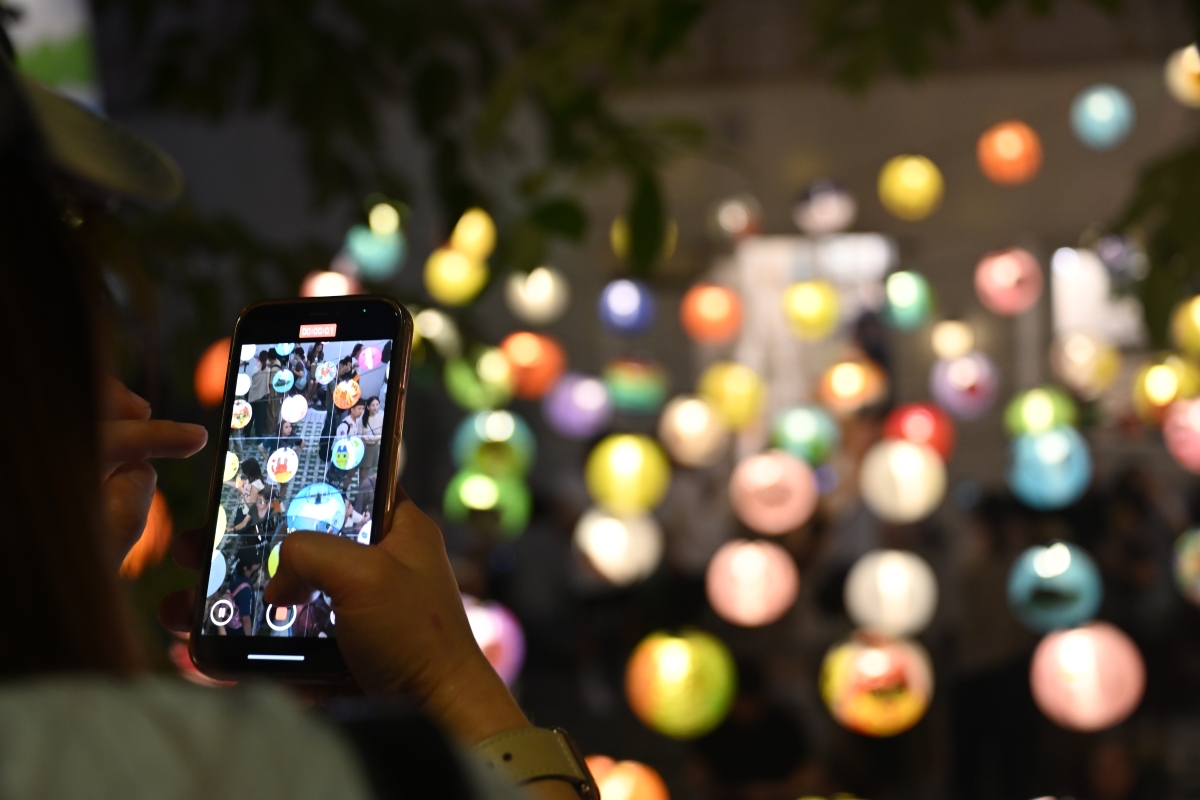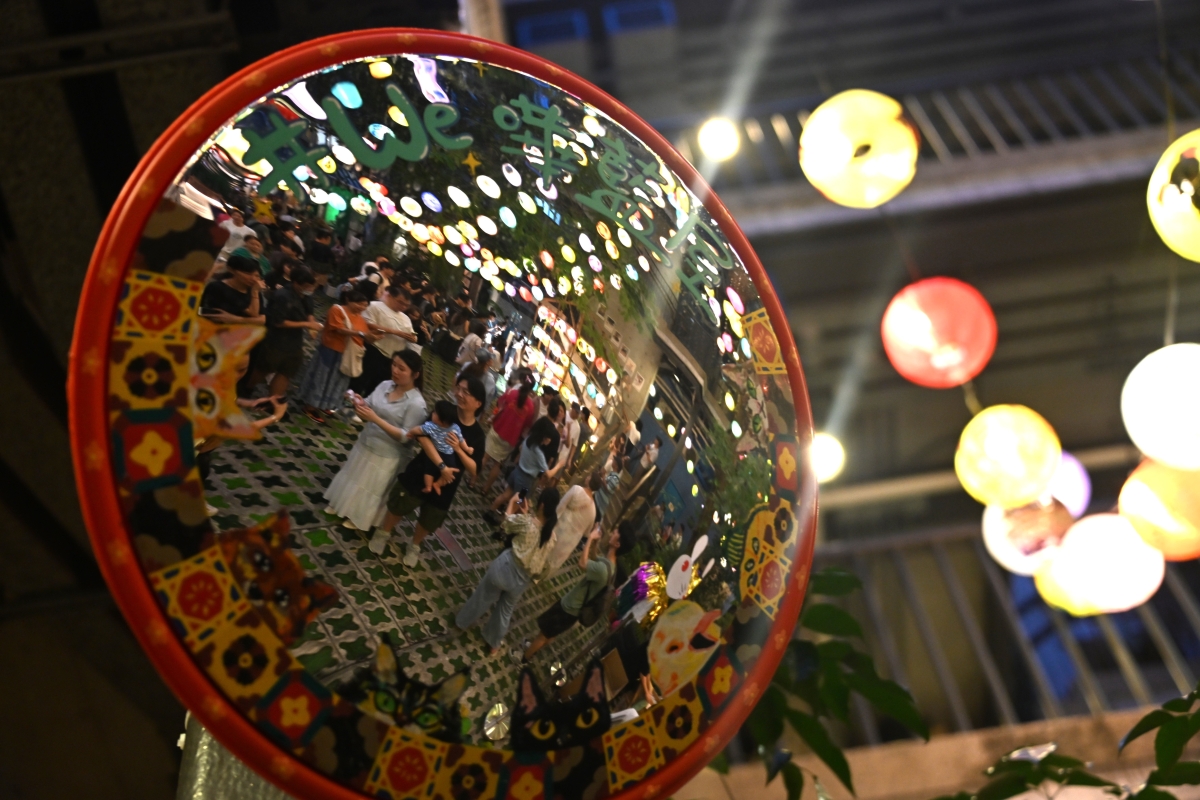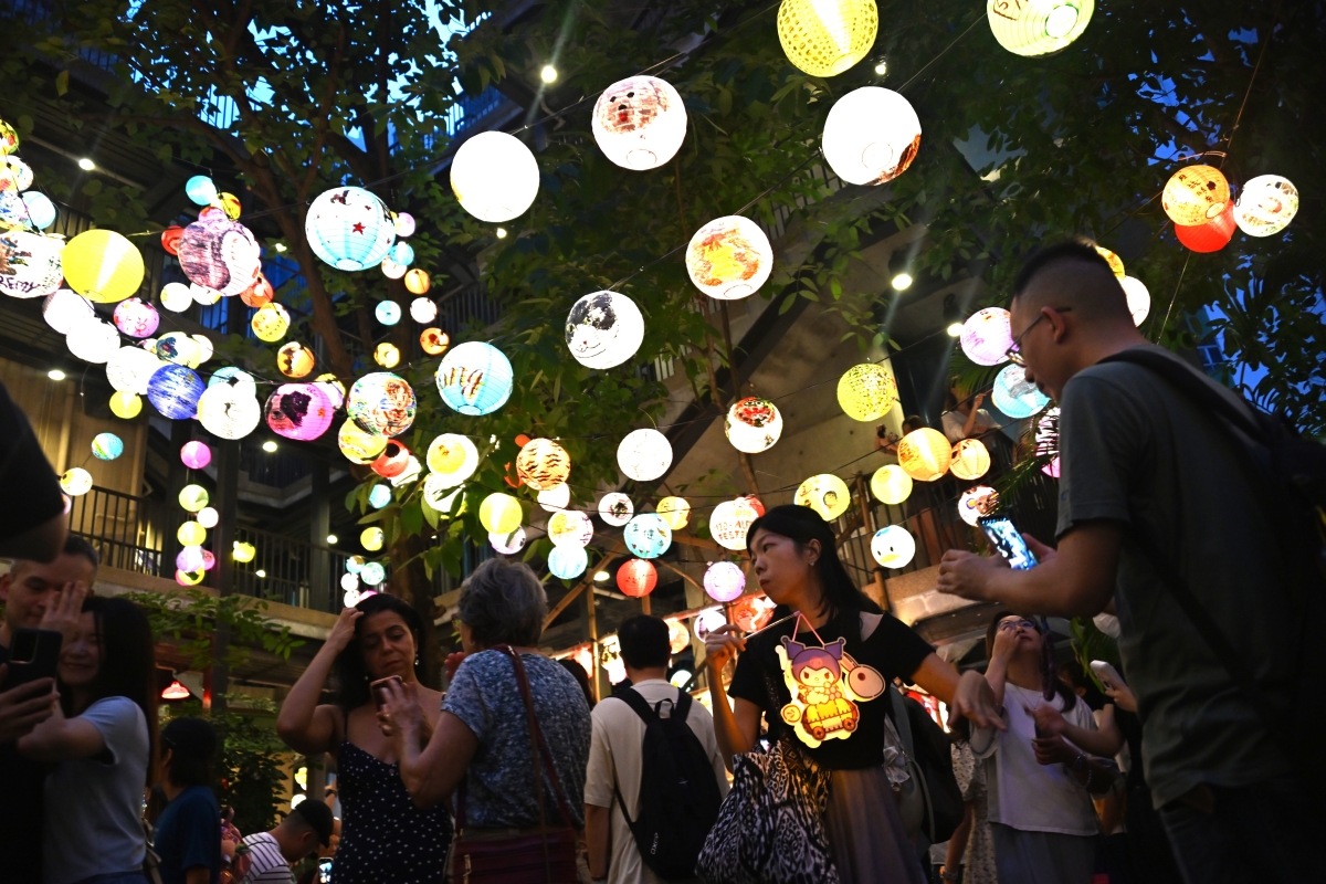 “藍屋”點亮主題為“悅夜月藍”的彩燈藝術裝置,逾700個由香港藝術家和灣仔街坊手繪的花燈,吸引大批市民和遊客欣賞和拍照打卡