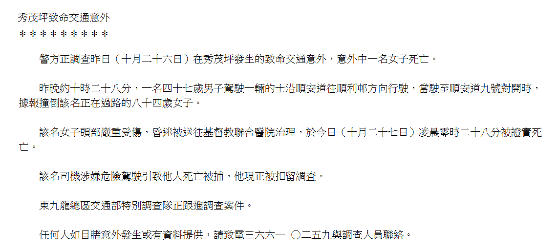 香港新聞網10月27日電 香港警方27日公佈,正調查26日晚在秀茂坪發生的致命交通意外,意外中一名女子死亡。