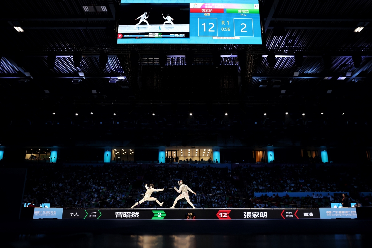 香港新聞網11月16日電(記者謝光磊)11月16日,第十五屆全國運動會男子花劍個人比賽在香港啟德體藝館舉行。 在銅牌爭奪賽中,香港選手張家朗擊敗以個人身份參賽的曾昭然,奪得銅牌。 世界排名第13位、兩屆奧運冠軍、28歲的張家朗迎戰曾於2023年奪得世青賽銀牌的20歲小將曾昭然。開賽先失1分,之後連取多分,只用了一節時間就以15:2大勝對手。