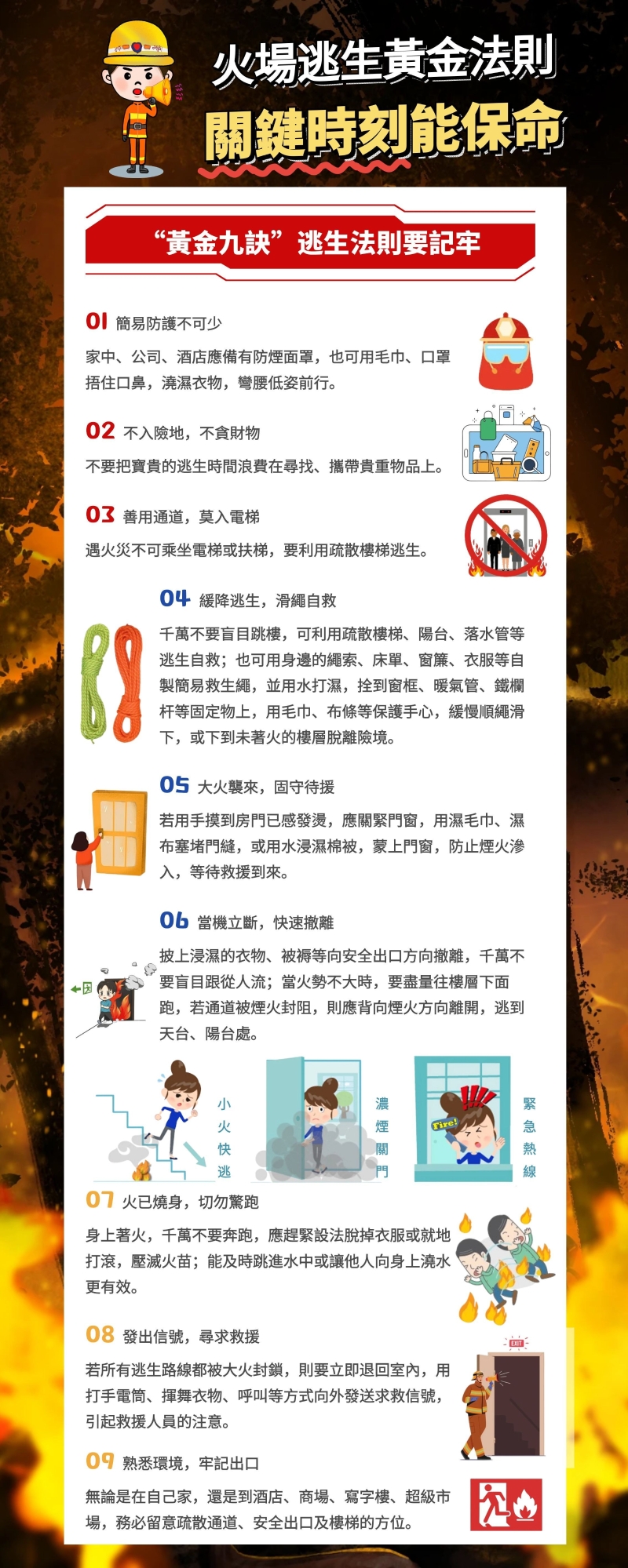 香港新聞網11月27日電 11月26日,香港大埔宏福苑一場罕見的五級大火,吞噬了數十條鮮活的生命,也讓數百個家庭在焦灼中等待。至截稿時,現場火災仍未被撲滅。冰冷的傷亡數字背後,是猝不及防的永別與支離破碎的家庭。 火災從不預演,生命沒有重播。若火災真的發生時如何正確逃生?若你身處高層建築、學校、醫院等場所,如何自救?當災害來臨莫慌,為自己和周圍的人創造最佳逃生機會!“火災逃生黃金九訣”快牢牢記在你的腦海中!(圖片製作:香港新聞網)