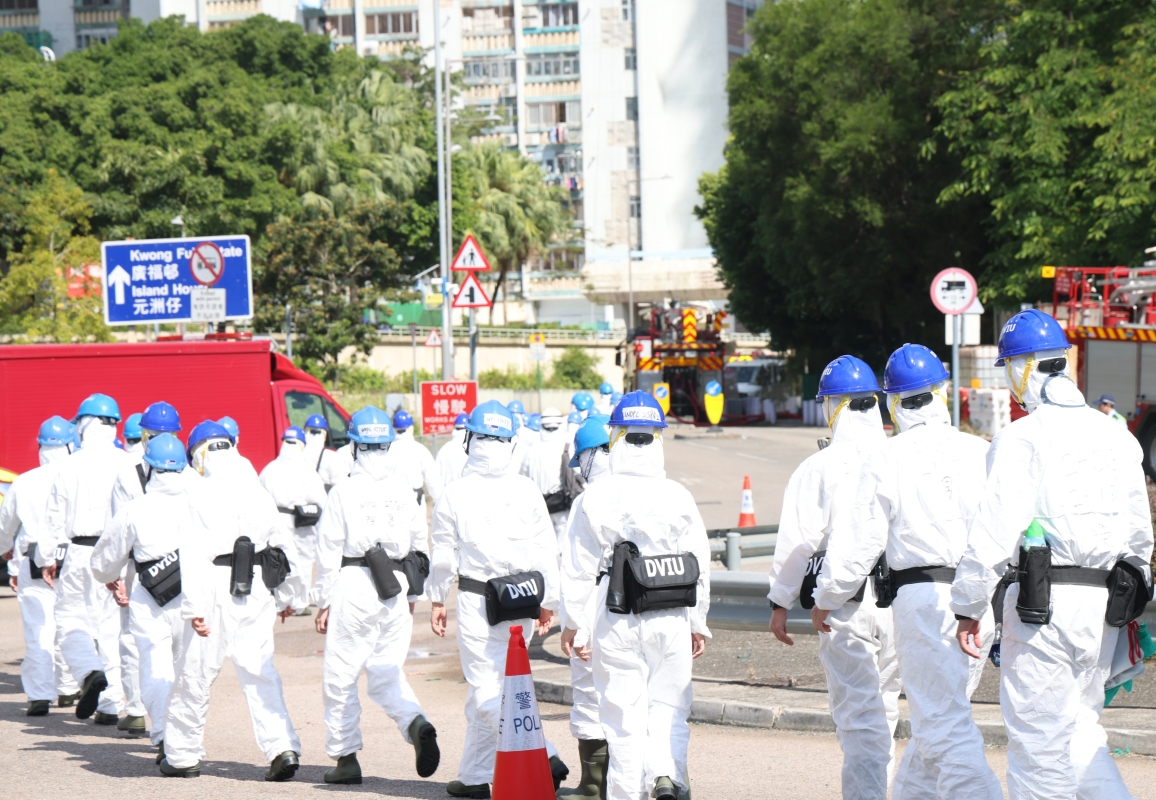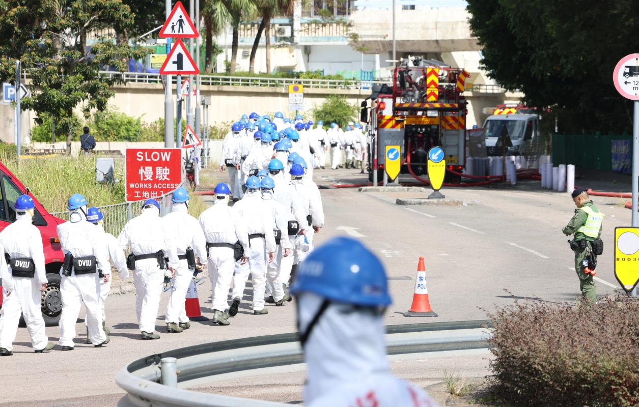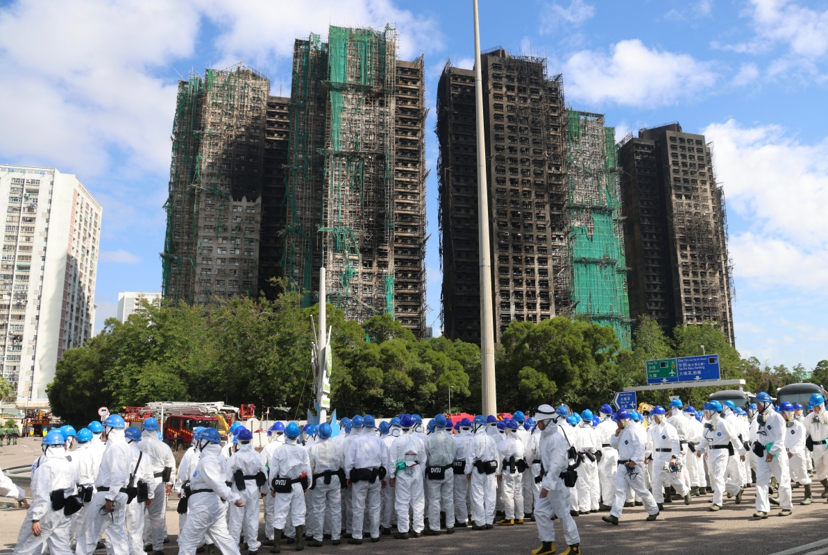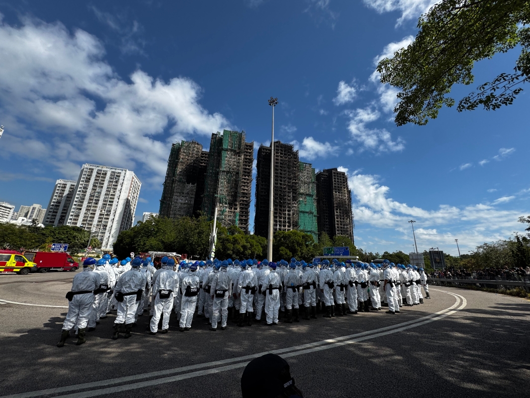 香港大埔宏福苑火災現場繼續圍封,警方災難遇害者辨認組(認屍組)約600多人中午抵達現場搜證。