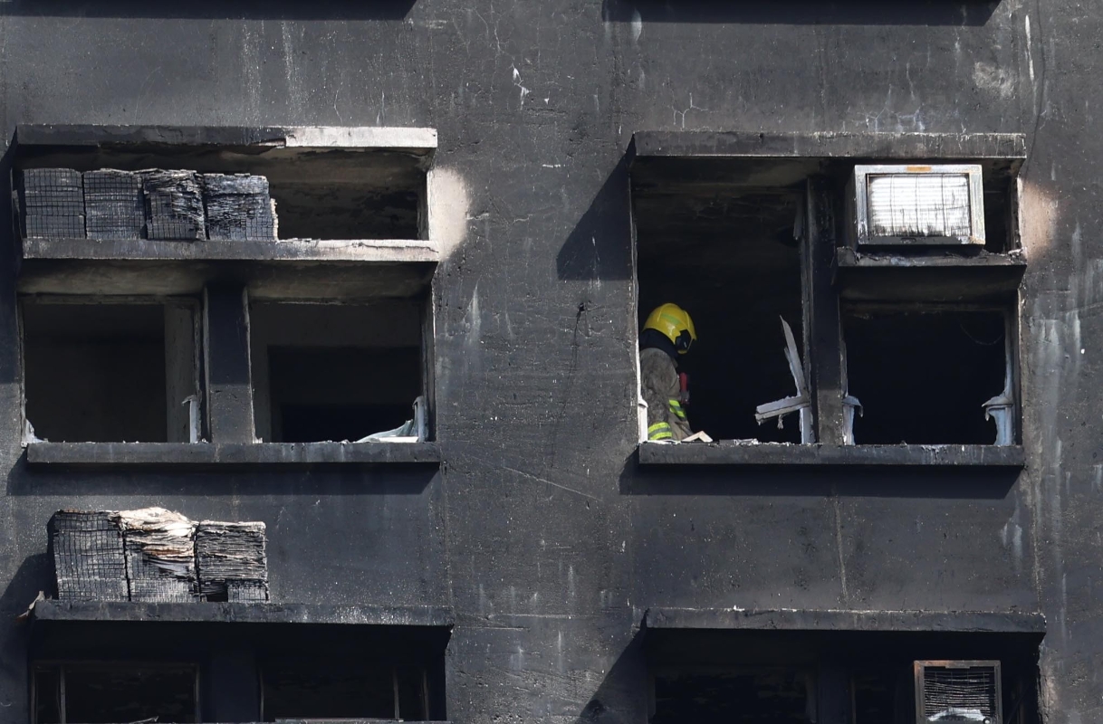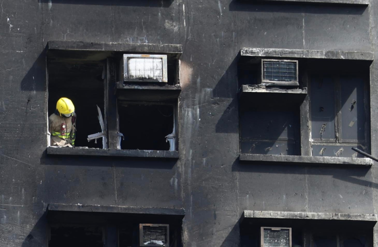消防員在焚廢的樓層排查。 【編輯:洪少葵】