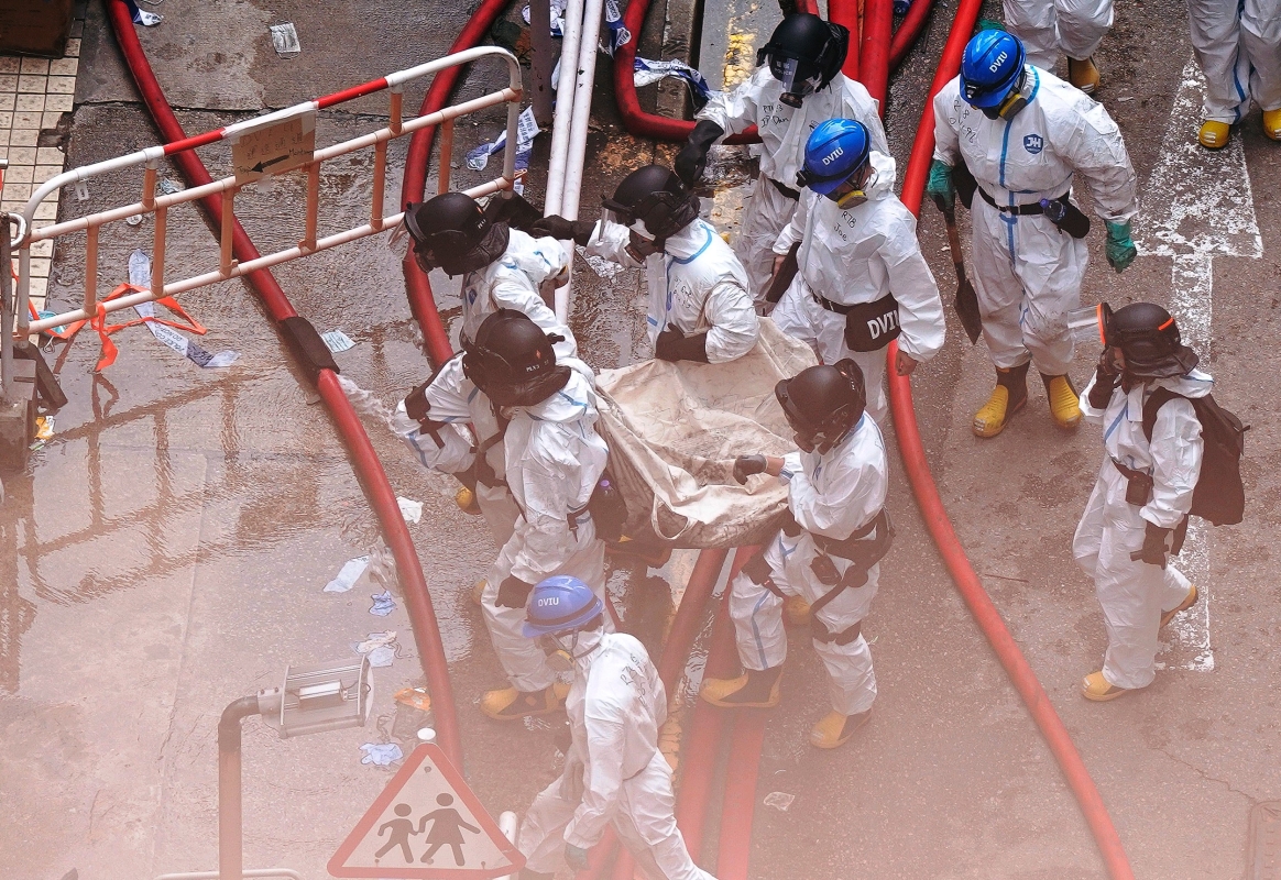 香港新聞網12月1日電( 圖文陳奕啟 )12月1日,香港大埔宏福苑五級火警第六日,警方和消防繼續在現場搜證。截止當日下午4時,罹難人數增至151人,其中警方的DVIU(災難遇害者辨認組)在最先起火的宏昌閣,移出8具遺體,其中的5具為最新發現,3具為較早前發現的。政務司司長陳國基表示,過去兩日在宏福苑20個不同地方採集棚網樣本,發現在宏泰閣、宏道閣、宏仁閣、宏志閣,共有7個分佈在高、中、低層不同地方的樣本,未達到阻燃測試標準。