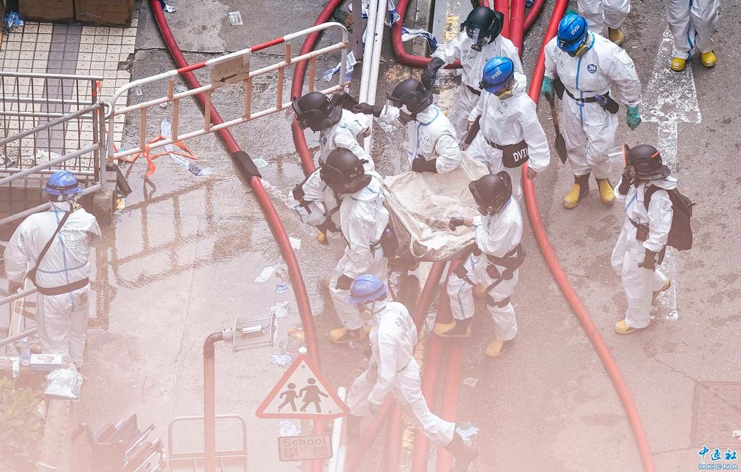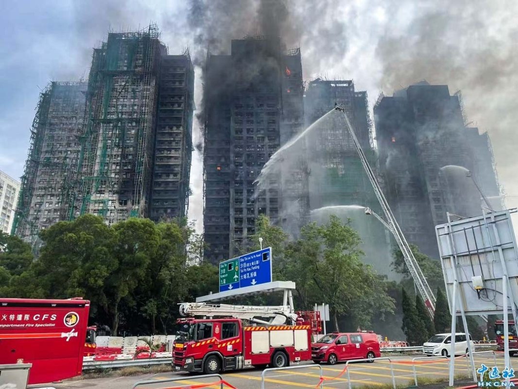 11月27日早上,香港大埔宏福苑五級火焚燒十多個小時後,仍未救熄,截至當天清晨6時,火警至今造成44死58傷。 死者包括一名殉職消防員。 留醫傷者當中有15人危殆、23人嚴重。現場消息指,消防員在火場陸續救出56名傷者。 (香港中通社 陳奕啟 攝)