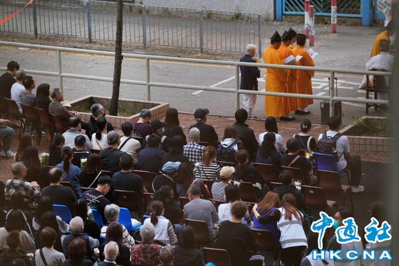 香港中通社圖片 道教和佛教中,習慣上認為“頭七”是人去世後的第六日晚上到第七日早晨,死者魂魄會於“頭七”回家,家人為死者魂魄預備一頓飯,燒香奉祀。 下午2時,儀式在宏福苑下面一個十字路口舉行,數位佛教僧侶、道教道士相繼誦經,祈願逝者往生極樂、離苦得樂。隨後,遇難者家屬代表上前獻花,表達哀思,不少家屬情緒激動。