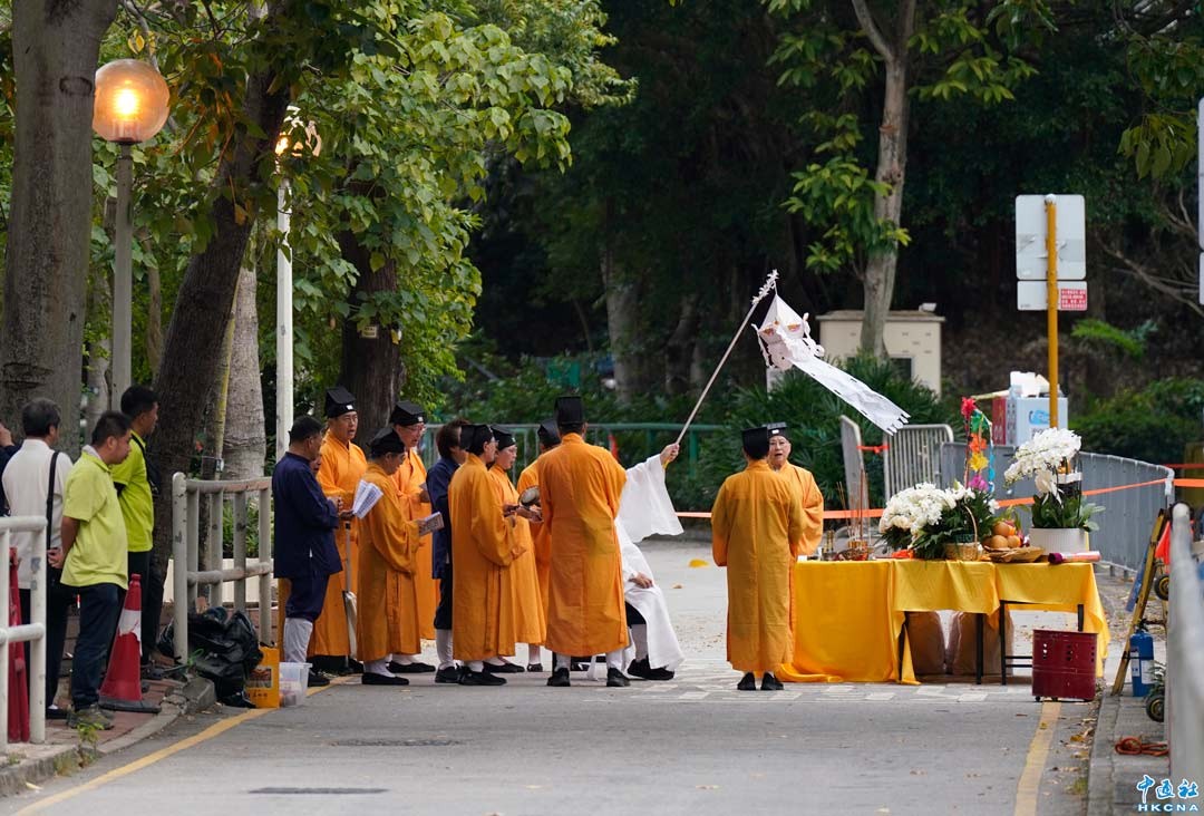 12月2日是大埔火災遇難者“頭七” ,火災後的灰燼尚未散盡,空氣仍殘焦灼氣息,現場有家屬路祭,分別有佛教及道教儀式,超度亡靈、撫慰生者,凝聚社會力量共同面對傷痛。(香港中通社 陳奕啟 攝)