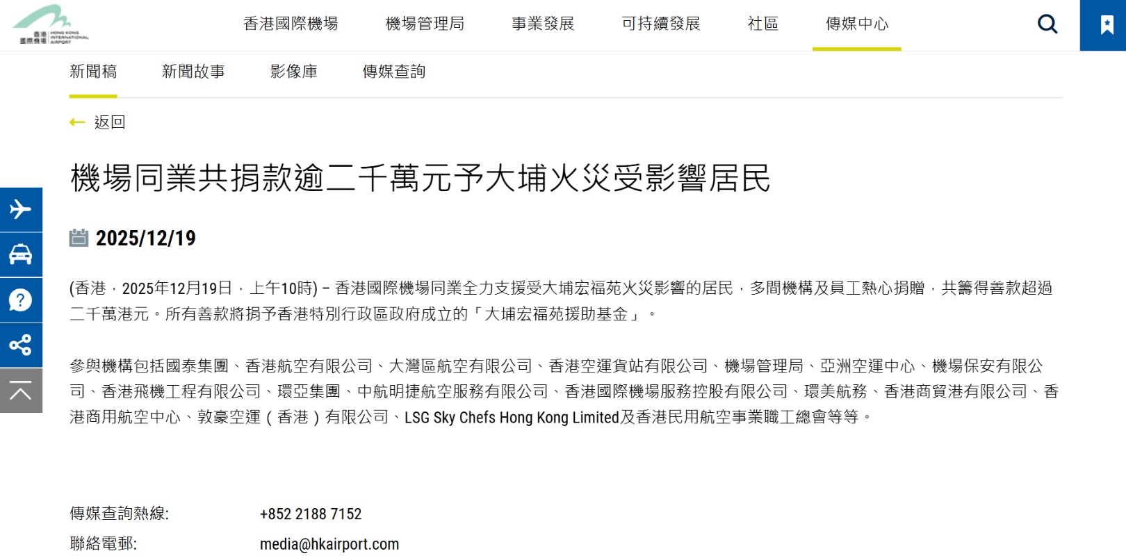 香港機場同業共捐款逾2000萬元予大埔火災受影響居民分享到: