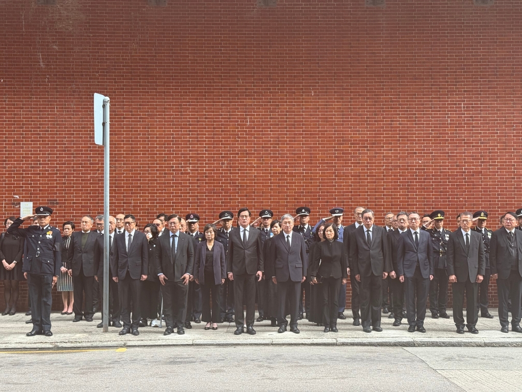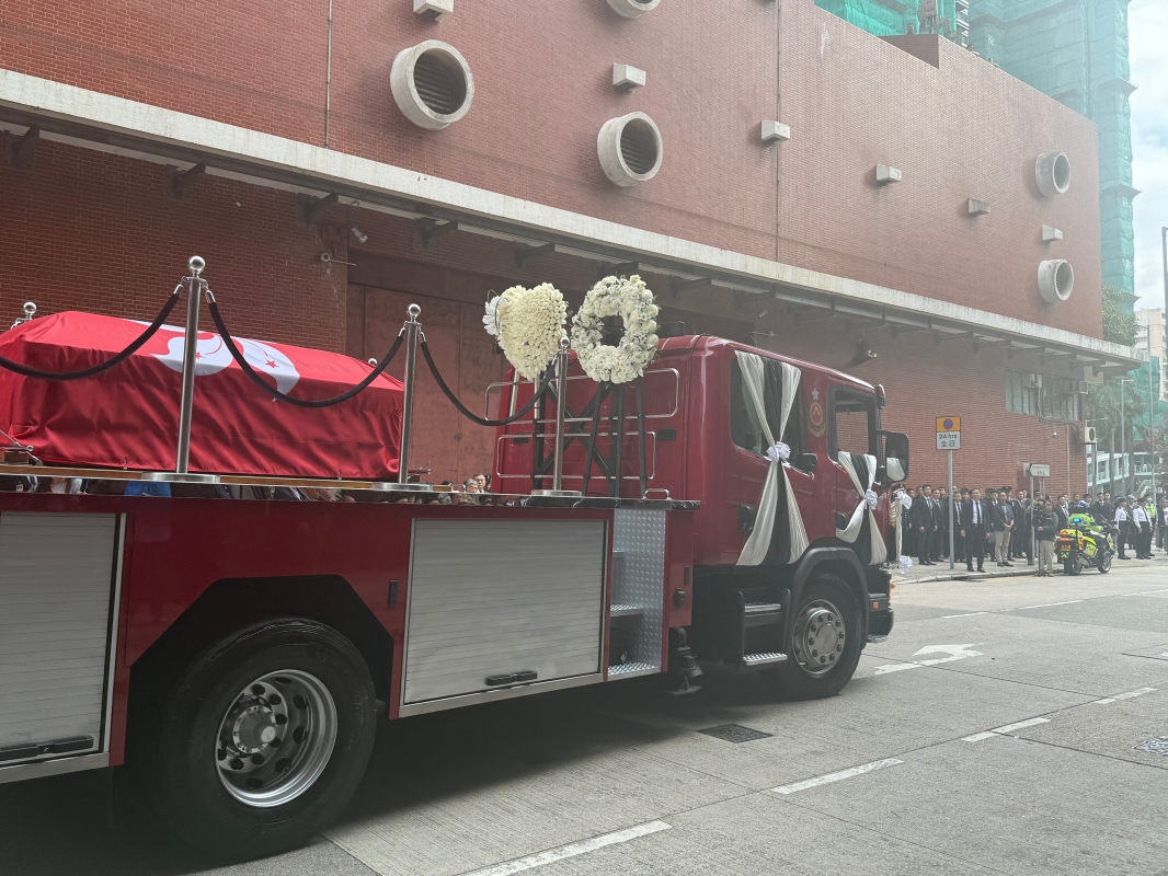 香港新聞網記者 譚暢攝 官方儀式完畢後,靈車約於上午10時30分離開殯儀館,特區政府官員及消防人員將列隊在殯儀館外向消防隊目何偉豪作最後致敬。