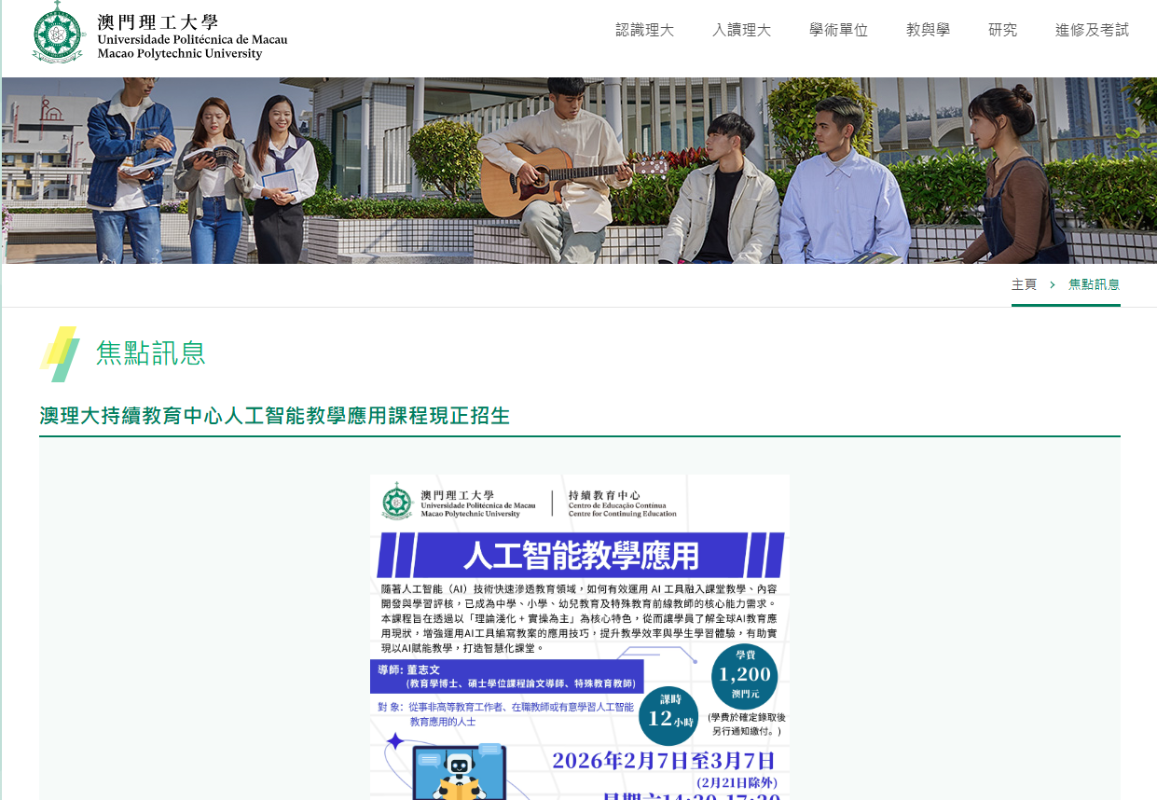 圖片來源:澳門理工大學官網截圖 校方表示,隨著AI技術在教育領域的快速發展,如何有效運用AI工具融入課堂教學、內容開發,以及學習評核已成為中學、小學、幼兒教育及特殊教育前線教師的核心能力需求。 據介紹,課程以理論淺化及實操為主,助教師實現以AI賦能教學,打造智慧化課堂。課程內容包括AI在教育的發展和大語言模型的教學提示詞;智能體(AI Agent)在教學的使用和AI在教學內容的開發;以及AI在輔助教學、教學評量和教學會議的使用。(完) 【編輯:林曉惠】