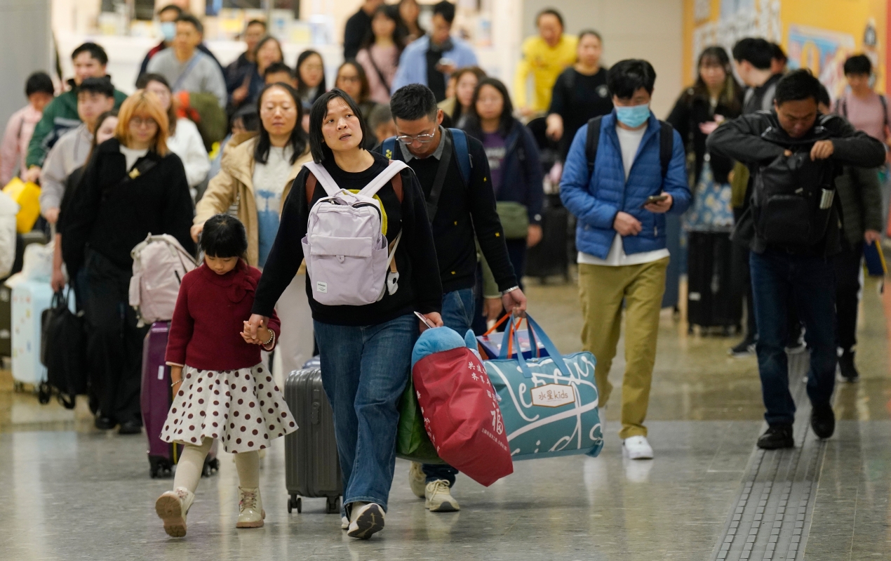 抵港的市民與遊客拖著行李走出高鐵站。