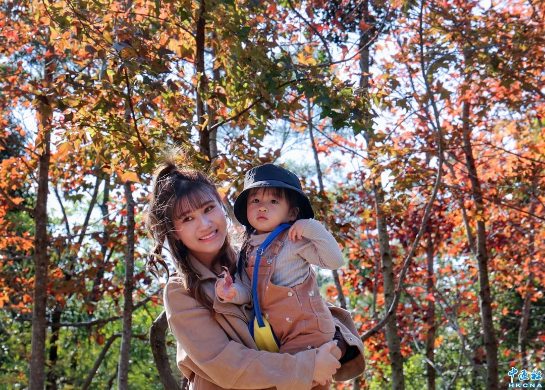 1月11日,香港迎來觀賞紅葉的最佳觀賞期,位於元朗大欖郊野公園的大棠楓香林是熱點地區之一,楓香林片片紅海,吸引不少市民及遊客特意前來觀賞遊玩,享受冬日之美。圖為有市民帶小孩拍照留念。(香港中通社記者 鄧梓傑 攝)