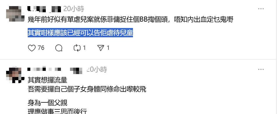 社交媒體Threads截圖 有網民分析,這樣容易讓孩子腦震蕩;也有有人質疑該參賽者為何沒有另一半或親朋好友幫忙照護小孩。也有網民表示:“如果唔小心kick親向前仆,bb就比佢壓住。(如果不慎往前摔倒,嬰兒就會被壓住)”“好恐怖仲要頭落地”“其實咁樣應該已經可以告佢虐待兒童。”