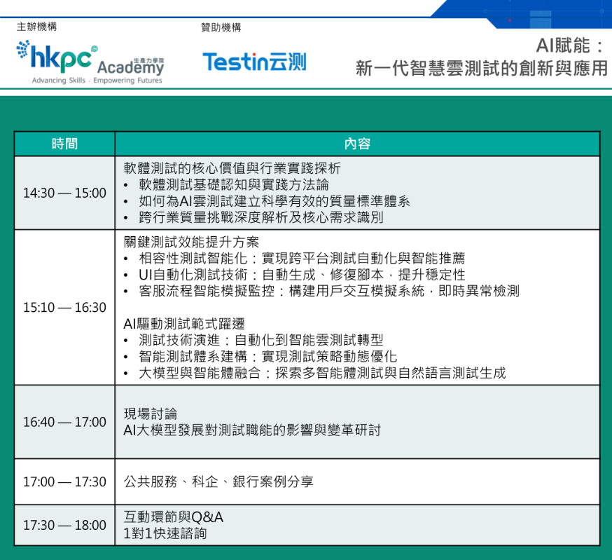 在香港人力成本高昂的背景下,單純依靠增加人力投入解決程式漏洞問題,不僅會大幅提升營運成本,還會面臨效率瓶頸。為助力香港企業破解這一困境,2026年1月23日,由香港生產力促進局生產力學院與AI測試領軍企業Testin雲測聯合主辦的《AI賦能:新一代智慧雲測試的創新與應用》線下沙龍即將啟幕。本次沙龍旨在向香港企業傳遞核心認知:AI測試並非未來概念,而是當前保障業務穩定運行的關鍵支撐。 業界視角:傳統自動化測試為何難以為繼? 過去數年,不少企業認為藉助Selenium或Appium工具編寫一套自動化測試指令碼,便可完成品質檢測工作。但進入2026年,這一模式已遭遇三大致命瓶頸: 1. 指令碼穩定性極差:現代應用程式包含大量動態元素與個人化推薦功能,傳統基於文件物件模型(DOM)樹定位的測試方法,僅需前端介面輕微調整,便會導致測試指令碼全面失效。品質檢測團隊需耗費大量時間修復指令碼,難以投入高價值的核心工作。 2. 多端環境適配複雜:隨著華為 HarmonyOS(華為鸿蒙系統)的全面普及及各類智慧終端的湧現,香港企業不僅需要適配iOS與Android兩大主流系統,還需應對折疊螢幕手機、穿戴裝置等多樣化終端形态。若採購全品類終端設備用於測試,將產生极高的成本支出。 3. 大模型應用測試困難:當應用程式嵌入AI客服、智慧投顧等大模型相關功能時,傳統“輸入A必然輸出B”的固定測試邏輯已完全失效。對於AI回覆的準確性、是否存在“幻覺”等問題,傳統測試方法無法實現有效檢測。 作為智慧雲測試領域的領軍企業,Testin雲測深刻洞悉香港企業的測試痛點。本次沙龍將摒棄空洞的理論宣講,聚焦實際應用場景,深入拆解如何通過大語言模型(LLM)與多智慧體(Multi-Agent)的結合,將測試系統升級為具備自主思考與路徑識別能力的虛擬測試員。