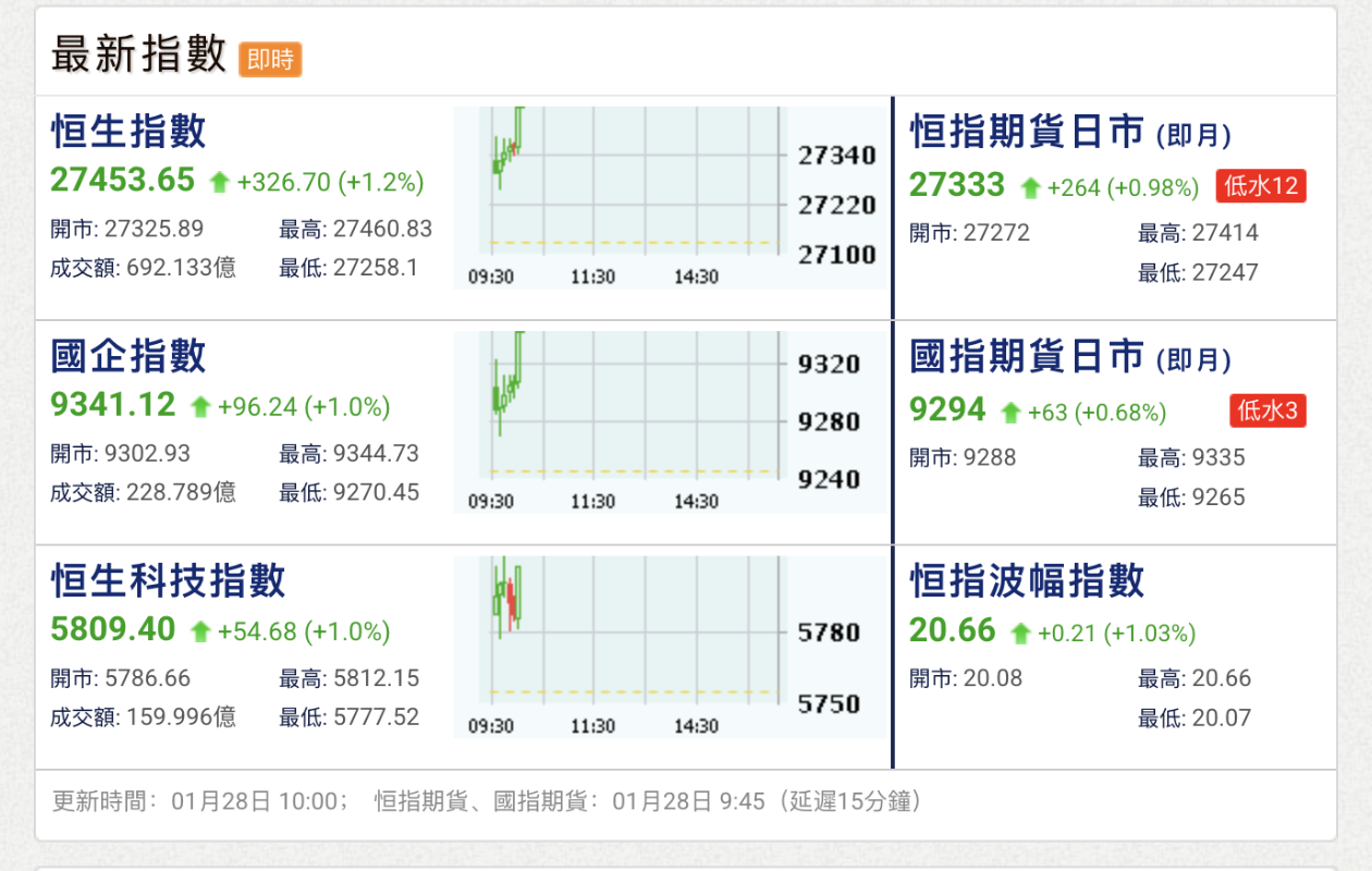 香港新聞網1月28日電 港股三大指數28日高開,恒指漲0.73%,國指漲0.63%,恒生科技指數漲0.56%。權重科技股普遍上漲,京東漲1.5%。