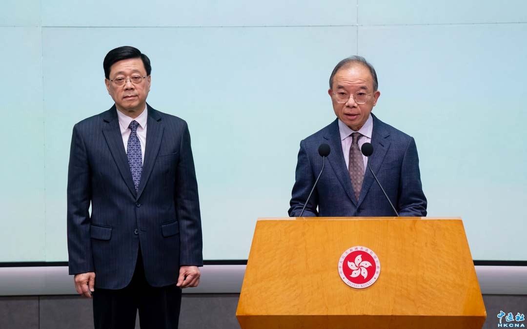 1月27日,香港特區行政長官李家超與政制及內地事務局局長曾國衞在行政會議前見記者。曾國衞表示早前因健康理由提出辭職。依照《中華人民共和國香港特別行政區基本法》的有關規定,根據香港特別行政區行政長官李家超的建議,國務院2026年1月27日決定:免去曾國衛的政制及內地事務局局長職務。(香港中通社記者 陳奕啟 攝)