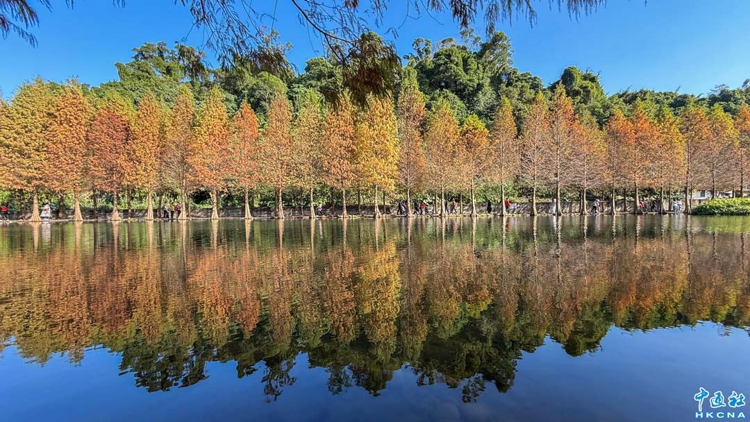 台灣桃園大溪月眉人工濕地周邊栽植近370棵落羽松,近期因天氣轉涼,落羽松紛紛由黃轉紅,相當美麗,也吸引許多遊客前往觀賞。 香港中通社圖片