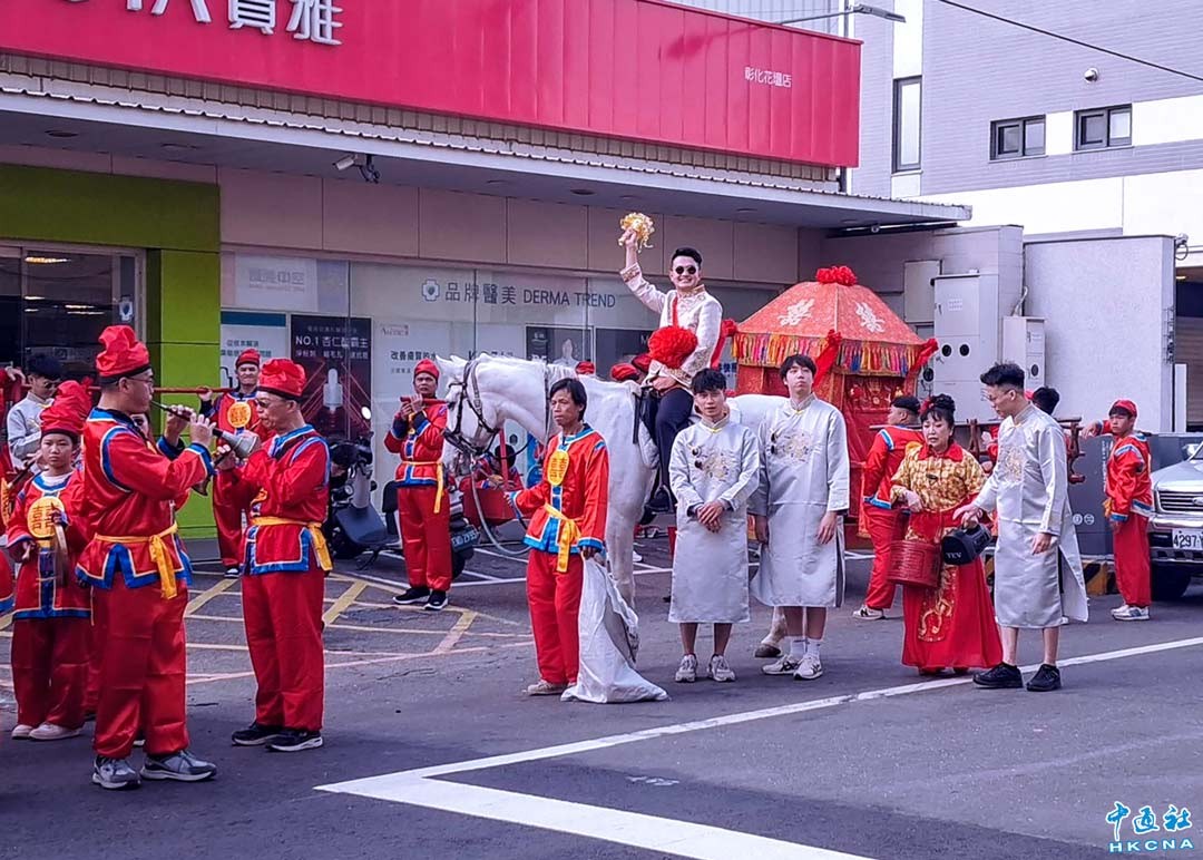 1月31日上午,台灣彰化縣花壇鄉街頭出現古式迎親隊伍,新郎騎白馬,伴著花轎,還有彩禮一牛車,在喜娘引領下,一路燃放鞭炮,敲鑼打鼓,前往花壇市區迎娶新娘,途人紛紛向新人表達祝福。香港中通社圖片