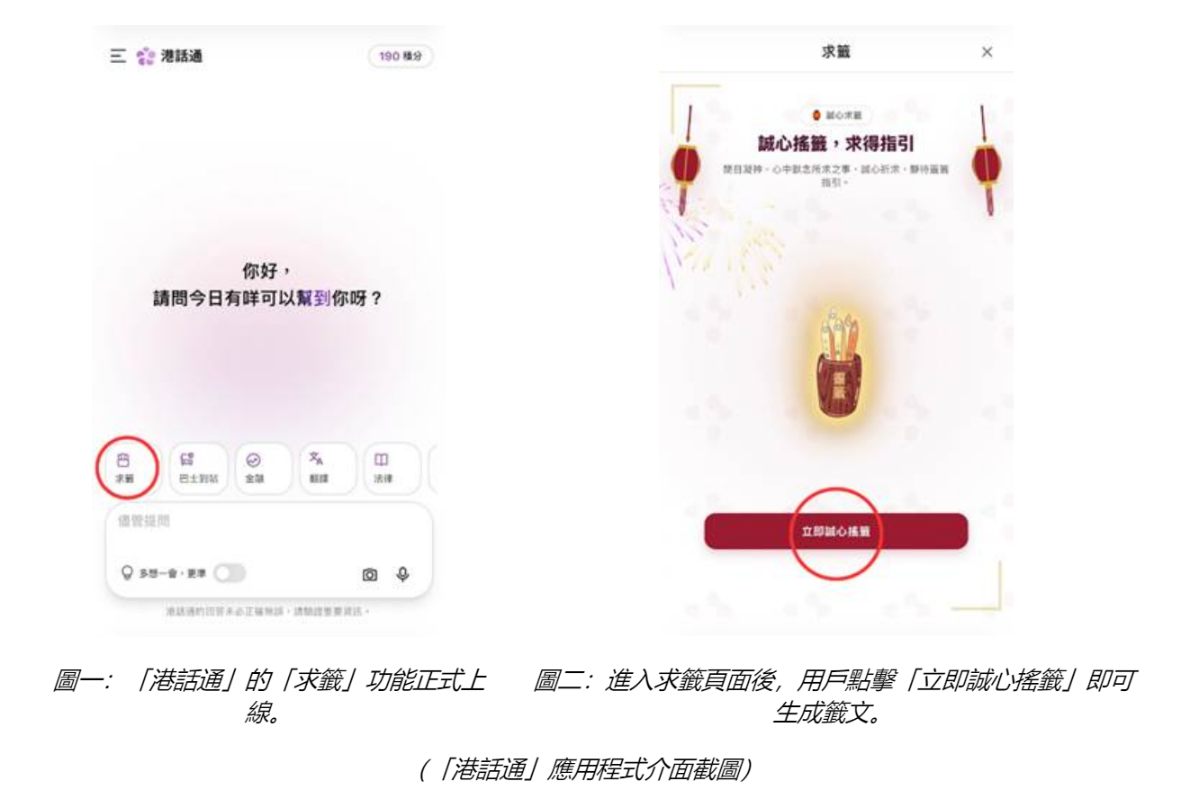 “港話通”應用程式介面截圖 研發團隊介紹,“港話通”的線上求籤功能,設計簡單易用,市民只需在“港話通”主頁點擊“求籤”,即可進入虛擬的籤筒界面。“求籤”功能分成“基礎求籤”及“大師深度解籤”兩部分,基礎求籤不扣分、不設上限,讓市民盡情探索馬年運程。而每次大師深度解籤需消耗 20 積分,每天最多可使用 5 次。 據介紹,用戶點擊“立即誠心搖籤”之後,“AI大師”便會現身進行基礎求籤,為用戶抽取一支籤文。籤文內容來自黃大仙祠,每支籤文均附有詳細的“解籤”和拆解,幫助用戶理解其含義。 此外,點擊“大師深度解籤”,系統提供“綜合運勢”、“愛情運”、“財運”、“事業運”四大選項,由“AI大師”即時為您指點迷津。無論想問感情運勢,抑或財運指引,“AI大師”都能針對用戶問題進行深度分析。“大師深度解籤”會因應籤文內容生成逐句解籤,並就用戶所選選項提出短中長期的建議行動、策略及心態。用戶亦可點擊“分享今日好運”,將籤文分享予親朋好友。 “港話通”產品研發團隊表示,AI近年已經深入市民生活的不同方面,是次引入線上“求籤”功能,旨在為AI應用加入趣味體驗,強調AI生成的結果屬於娛樂性質,僅供用戶參考。 “港話通”是為香港市民提供AI智能諮詢服務的平台,由“InnoHK創新香港研發平台”旗下“香港生成式人工智能研發中心(HKGAI)”研發、港話通全維服務有限公司營運。平台採用HKGAI的人工智能大語言模型技術,支援廣東話、普通話及英語三語融合,並整合本地知識庫及政府公開數據,為市民日常生活提供安全、可靠、便捷的資訊服務,讓生活更智能、更方便。(完) 【編輯:梁嘉軒】