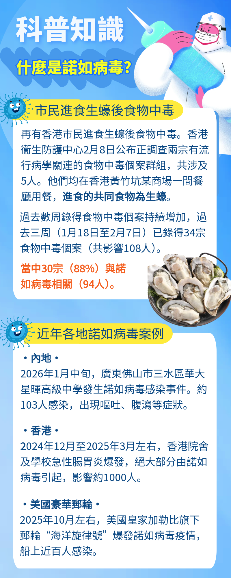 衞生防護中心總監徐樂堅稱,過去數周錄得食物中毒個案持續增加,過去三周(1月18日至2月7日)已錄得34宗食物中毒個案(共影響108人),當中30宗(88%)與諾如病毒相關(共影響94人)。諾如病毒怎麼防?香港新聞網為讀者解讀。