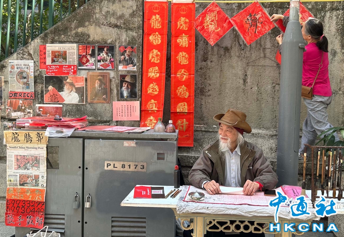 另一邊,戴著牛仔帽的八旬“寫匠”郭騰龍在此擺檔20餘年。客人經過,他先朗聲打招呼;客人躊躇,他也任由對方在紅紙前靜思片刻。他對記者說,除了颳風下雨,天天都在。這些年來,“福”、“健康平安”等揮春特別暢銷——疫情幾度,大家求的終歸是歲月靜好。