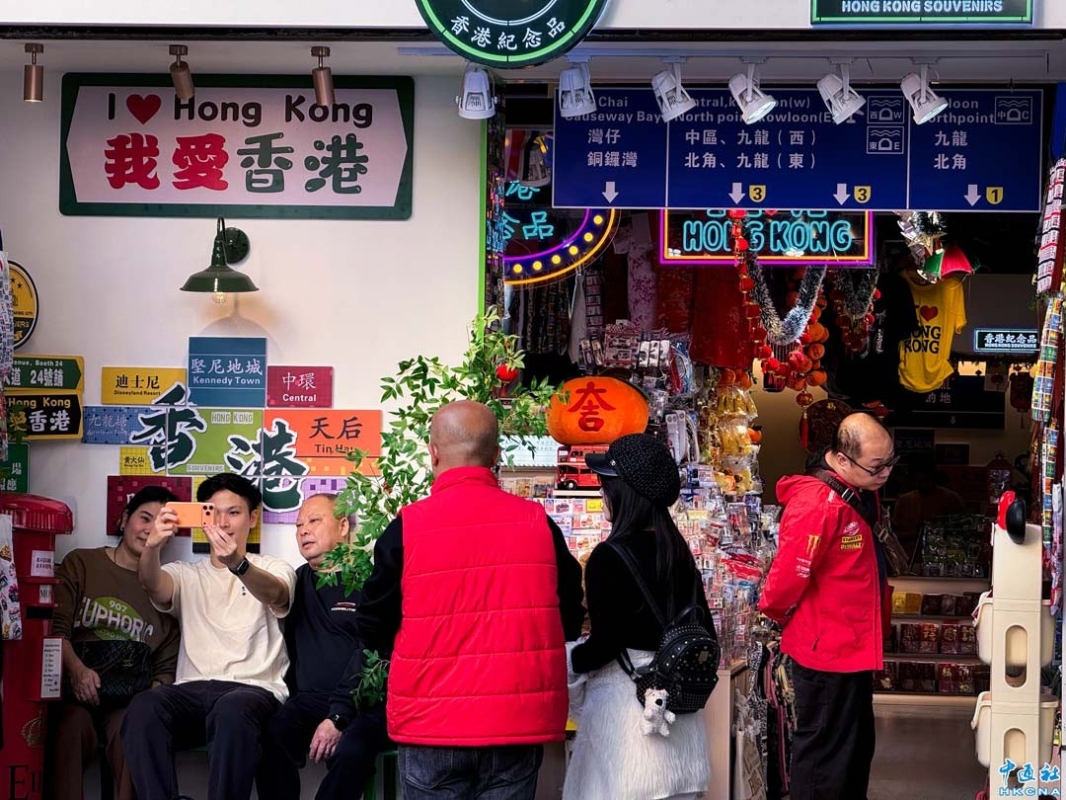 2月18日,遊客在尖沙咀一售買旅遊紀念品商店前打卡留念。馬年農曆春節期間,香港迎來大批旅客,各大熱門景點人頭攢動,一片繁華。(香港中通社記者 徐文峰 攝)
