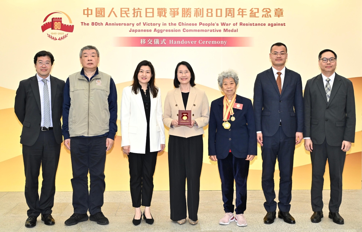 儀式上,國務院港澳事務辦公室五局副局長李麗代表中央政府贈送紀念章,由康樂及文化事務署署長陳詠雯代表特區政府接受。陳詠雯致辭時感謝中央政府的饋贈,讓香港市民能有機會欣賞紀念章及體會其深厚意義,增強愛國情懷。紀念章27日起在香港抗戰及海防博物館的“風雨同舟共建和平——粵港人民抗戰勝利八十周年展”專題展覽展出。 其他出席儀式的嘉賓包括原東江縱隊港九獨立大隊老游擊戰士聯誼會會長林珍及副會長林鳴、港澳辦五局一處調研員劉萌、康文署助理署長(文博)伍志和,以及弘揚中華文化辦公室總監張銳森。 為紀念抗戰勝利80周年,國家於2025年為健在的抗戰老戰士、老同志、抗戰將領或其遺屬頒發紀念章。紀念章以《走向勝利》雕塑為中心,包含延安寶塔山、黃河、五星、光芒、橄欖枝及和平鴿等元素。 (完) 【編輯:譚暢】