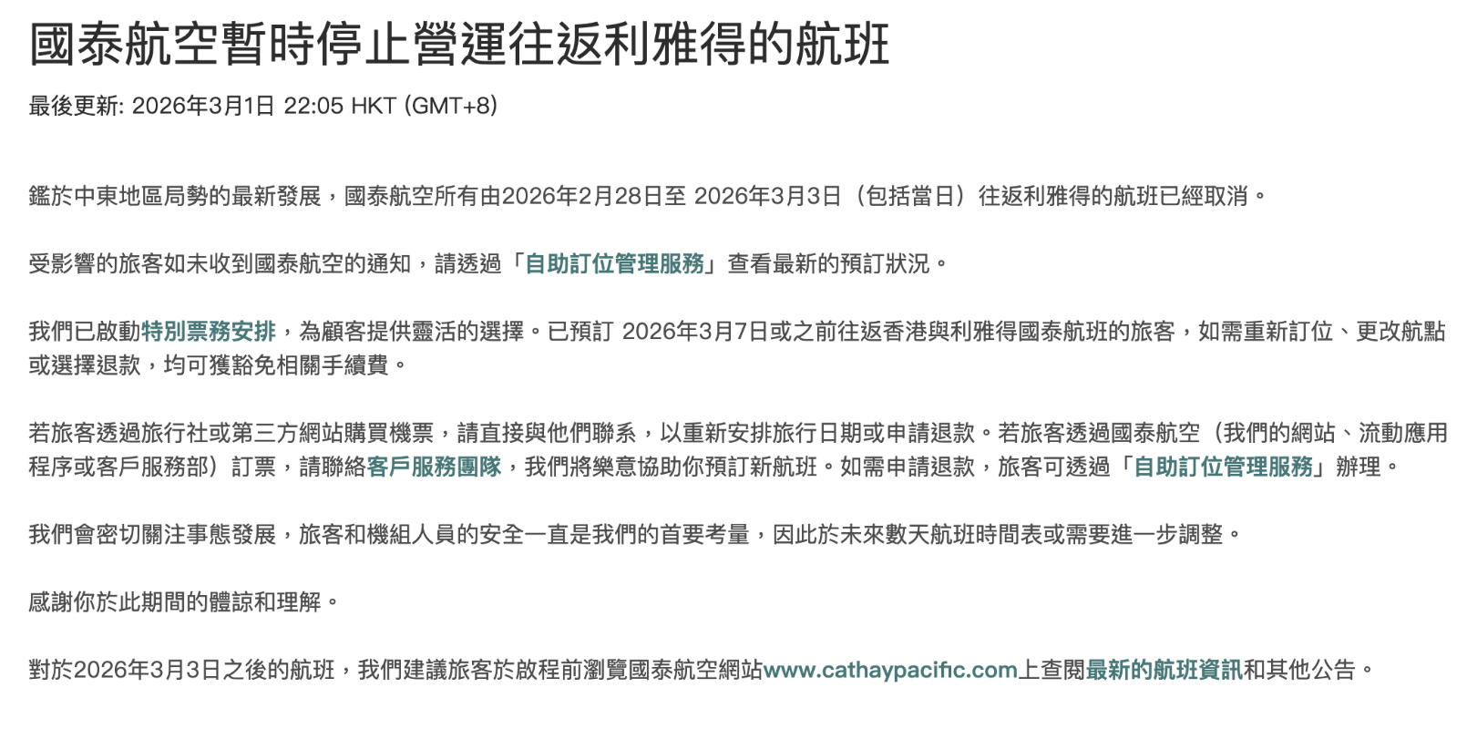 國泰航空宣布,受影響的旅客如未收到國泰航空的通知,請透過“自助訂位管理服務”查看最新的預訂狀況。國泰已啟動特別票務安排,為顧客提供靈活的選擇。已預訂 2026年3月7日或之前往返香港與利雅得國泰航班的旅客,如需重新訂位、更改航點或選擇退款,均可獲豁免相關手續費。 國泰表示會密切關注事態發展,旅客和機組人員的安全一直是首要考量,因此於未來數天航班時間表或需要進一步調整。(完) 【編輯:陳卓儀】
