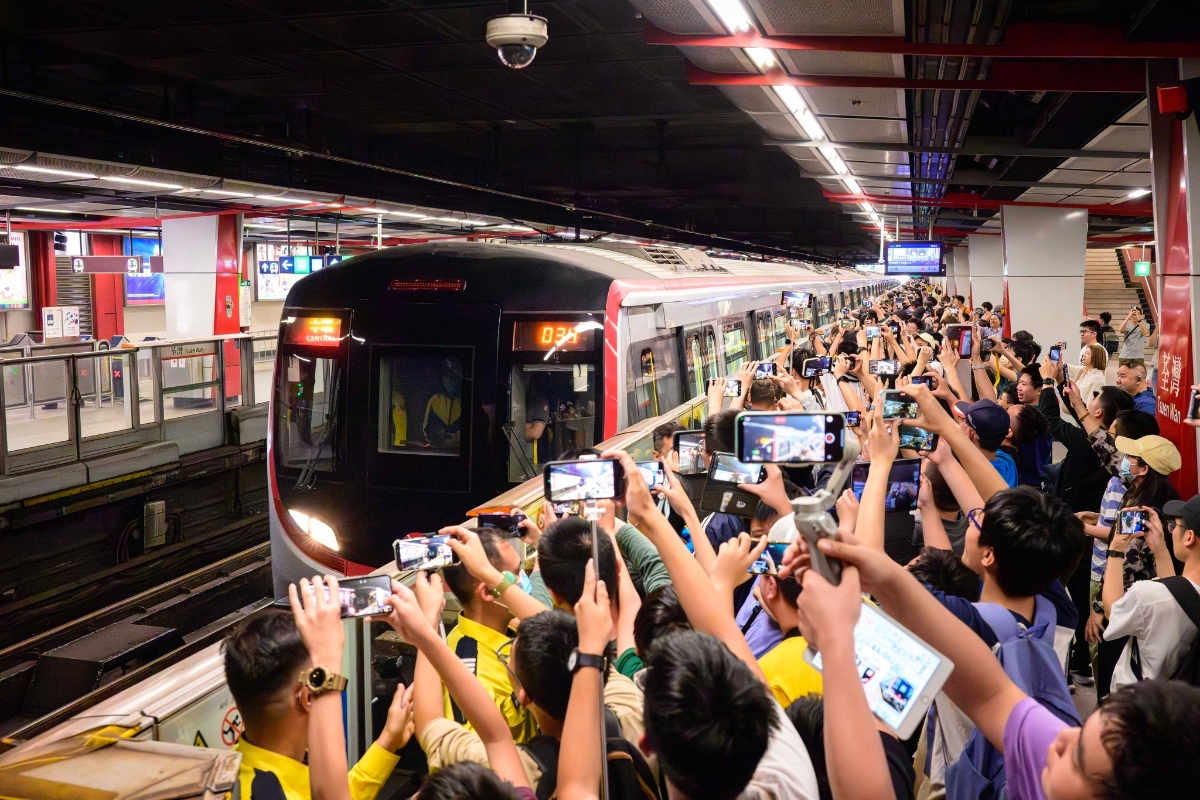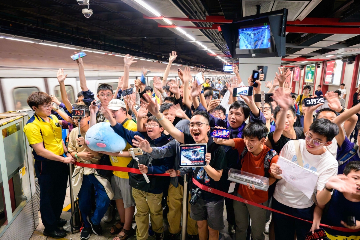 逾百名香港鐵路迷到場爭相體驗首班車。圖源:港鐵FB 鐵路迷個個心情興奮 當天早上9時47分,首班特別班次列車由柴灣站開出,前往堅尼地城站方向。在往中環方向的月台上,早早就擠滿了熱情的鐵路迷,個個神情興奮,翹首以盼新列車的到來。 上午近11點,第一列使用新信號系統的“Q-Train”列車駛入月台,等候多時的鐵路迷們瞬間沸騰起來,集體歡呼。列車剛一停穩,車門還未打開,鐵路迷們就迫不及待地齊聲大喊“開門、開門、開門……”待車門一開,便蜂擁而上,都想第一時間體驗這國產新列車的魅力。