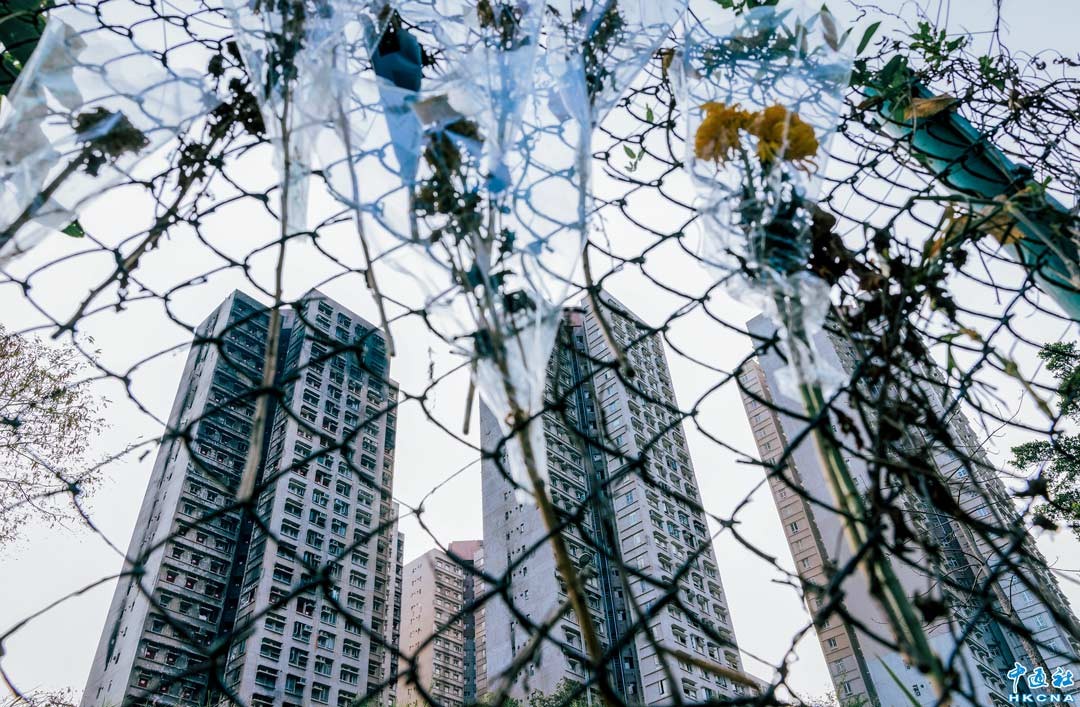 3月27日,香港政務司副司長卓永興、保安局局長鄧炳強、房屋局局長何永賢及民政及青年事務局局長麥美娟見記者,公佈宏福苑受災居民可於4月20至5月4日回單位執拾,最多停留3小時。圖為拆卸棚架後的宏福苑。(香港中通社記者 陳奕啟 攝)
