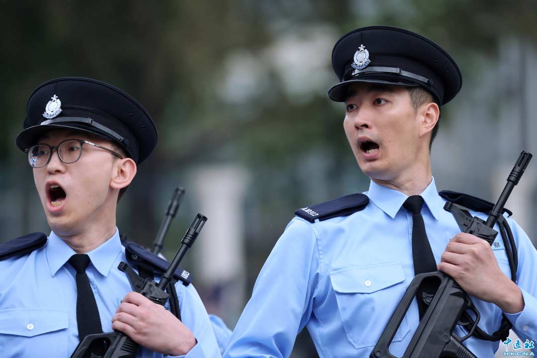 3月28日,香港輔助警察隊舉行結業會操,共有70名輔警警員成功完成輔警基本訓練,並在署理政制及內地事務局局長胡健民的檢閱下昂然結業。(香港中通社記者 謝光磊 攝)