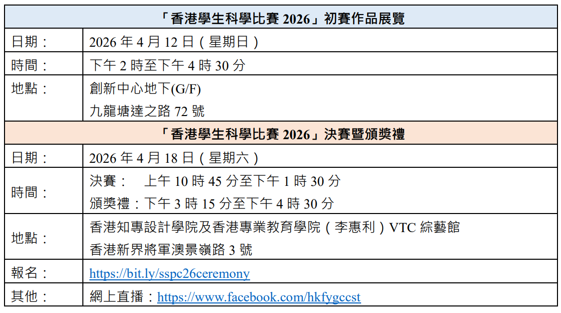 初賽暨作品展覽 初賽將於4月12日在九龍塘創新中心舉行,同場設有作品展覽,公眾可到場欣賞逾百份學生的發明品及科學研究,並投選心儀作品。獲觀眾票選最多的隊伍將獲頒“觀眾最喜愛大賞”。 決賽暨頒獎禮 晉級決賽的20支最優秀隊伍將於4月18日向專業評審團介紹其發明品或科研成果,並進行詳盡演說,角逐多項殊榮。專業評審團由主辦機構及學術界代表組成,當中包括香港城市大學協理學務副校長(數碼學習)張澤松教授及香港理工大學科學院院長黃維揚教授等。 比賽設有多個獎項類別,以嘉許及表揚學生在多元領域的卓越表現。 初中組及高中組:(A類)發明品與(B類)研究項目將競逐冠、亞、季軍榮譽;(C類)發明品專案設計及(D類)研究項目專案設計,則頒發一等獎及二等獎,嘉許具潛力及可行性的科學提案。 主題獎項:特設新秀大賞、最具潛質獎、可持續發展大賞、社會創新大賞、年度主題大賞,以及由公眾投票產生的觀眾最喜愛大賞。 科學海報組:設有一等獎、二等獎及年度主題大賞,鼓勵學生以視覺方式呈現科學概念。 公眾人士可現場參與或透過網上直播觀賽,感受科學競賽的熾熱氣氛,共同見證新一屆青年科學家的誕生。 自1998年起,“香港學生科學比賽”一直為本地中學生提供創科培訓,發掘並嘉許具潛質的科研精英,資助他們參與各項海外比賽和內地創科交流活動,擴闊國際視野,增進科學和科技相關知識,為香港培育未來的科學家和發明家。 如欲了解更多有關比賽、投票詳情、得獎名單及參賽作品等資訊,可瀏覽以下網站: https://hksspc.hkfyg.org.hk。(完)