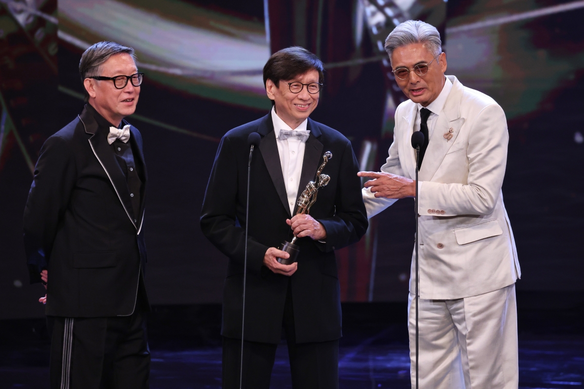周潤發(右)、劉偉強(左)為朱家欣(中)頒發終身成就獎
