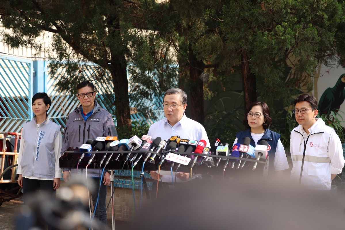 香港特區政務司副司長卓永興、保安局局長鄧炳強、房屋局局長何永賢、民政及青年事務局局長麥美娟和勞工及福利局局長孫玉菡早上視察上樓安排的準備情況後,在大埔浸會公立學校會見傳媒。