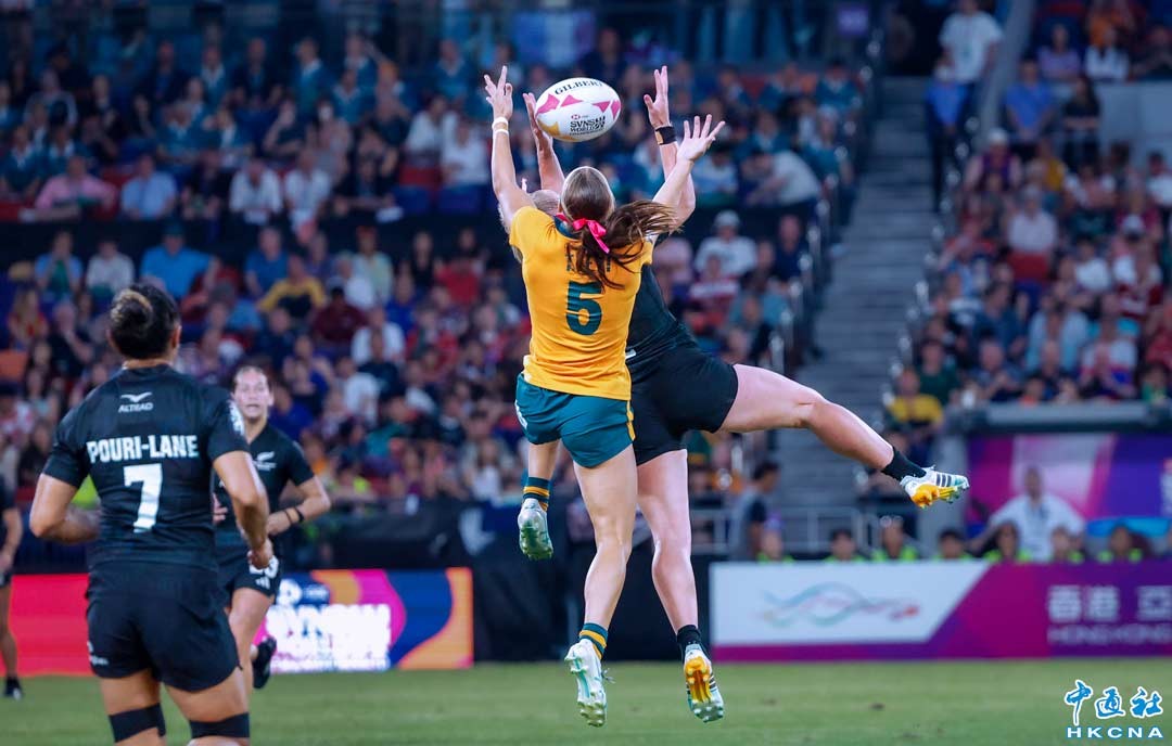 4月19日,香港國際七人欖球賽。女子組決賽由新西蘭隊(黑)以19:14擊敗澳洲隊奪得冠軍。(香港中通社記者 陳奕啟 攝)