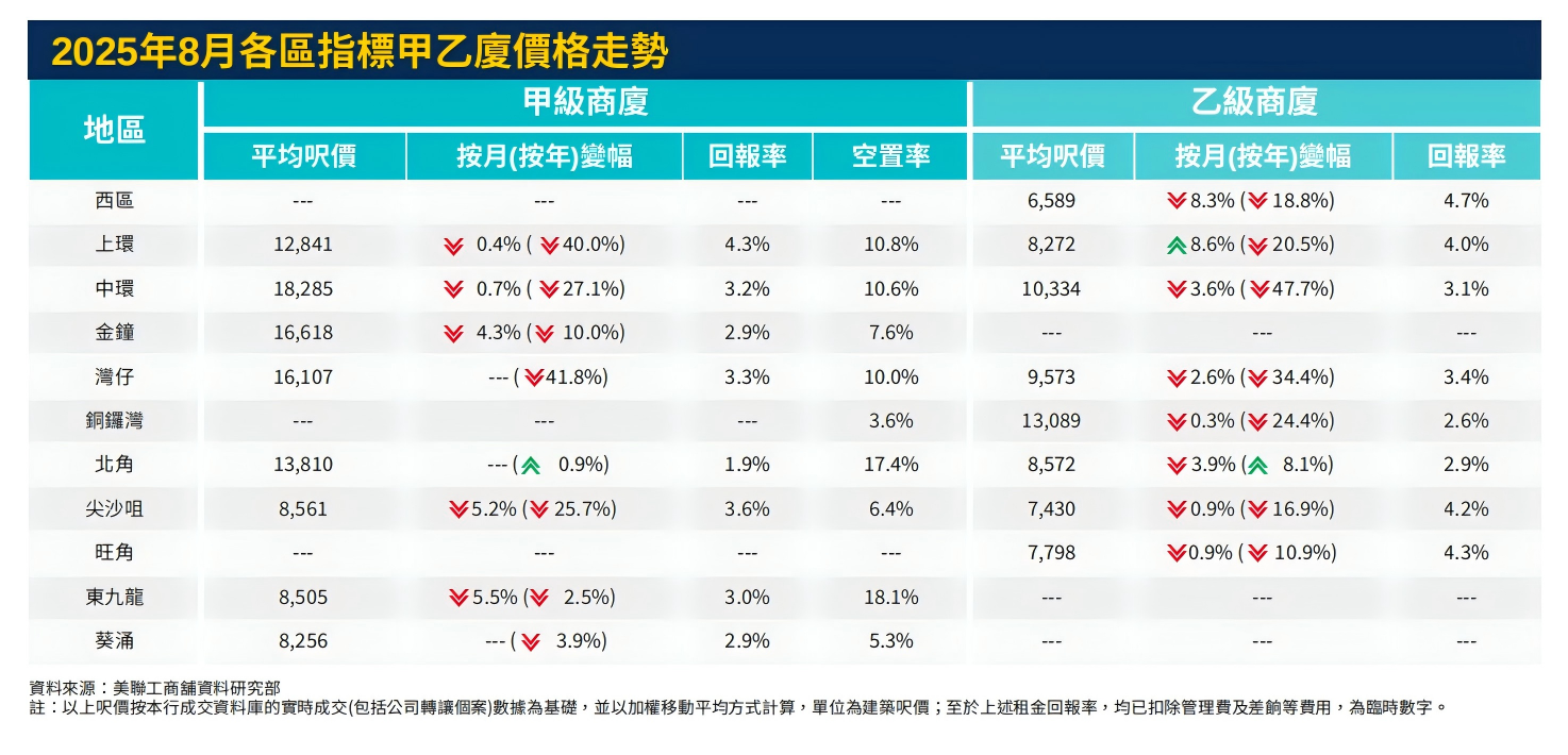 圖源:美聯 核心區甲廈受捧 用家積極入市 根據美聯工商舖資料研究部數據,8月份商廈註冊成交宗數回落,錄得89宗成交,按月減少約14.4%,但總結今年以來的數字,頭八個月的成交合共有741宗,較去年全年的數字多出1.9%。此外,50大指標甲廈成交宗數連升兩個月,一共錄得9宗,按月增加28.6%。至於售價方面,商廈價格調整的趨勢持續,其中,指標甲廈及乙廈售價按月分別下跌約2.9%及1.3%。