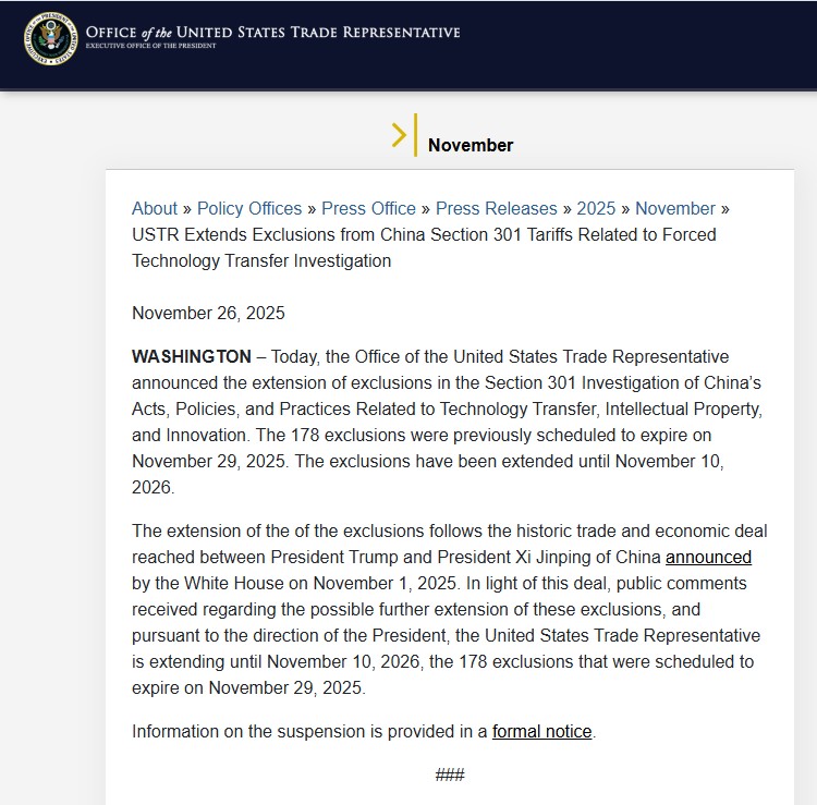 美國將部分對華關稅豁免期延長至2026年11月10日